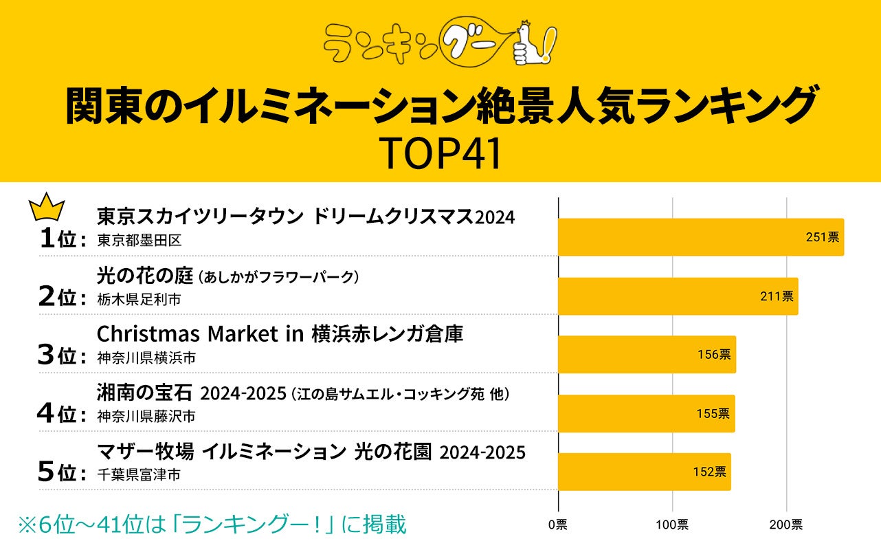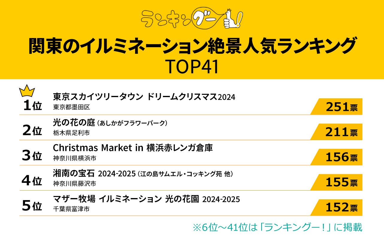 株式会社CMサイト(本社:大阪府大阪市、代表取締役社長:柴原 誠治)が企画編集する、「ちょっと気になる」を調べたランキングサイト『ランキングー!(https://rankingoo.net/)』は、『関東のイルミネーション絶景人気ランキングTOP41【2024-2025】』の結果を、投票者のコメント付きで紹介する記事として公開しました。