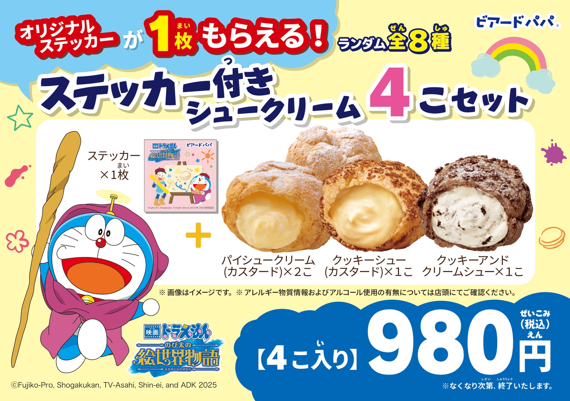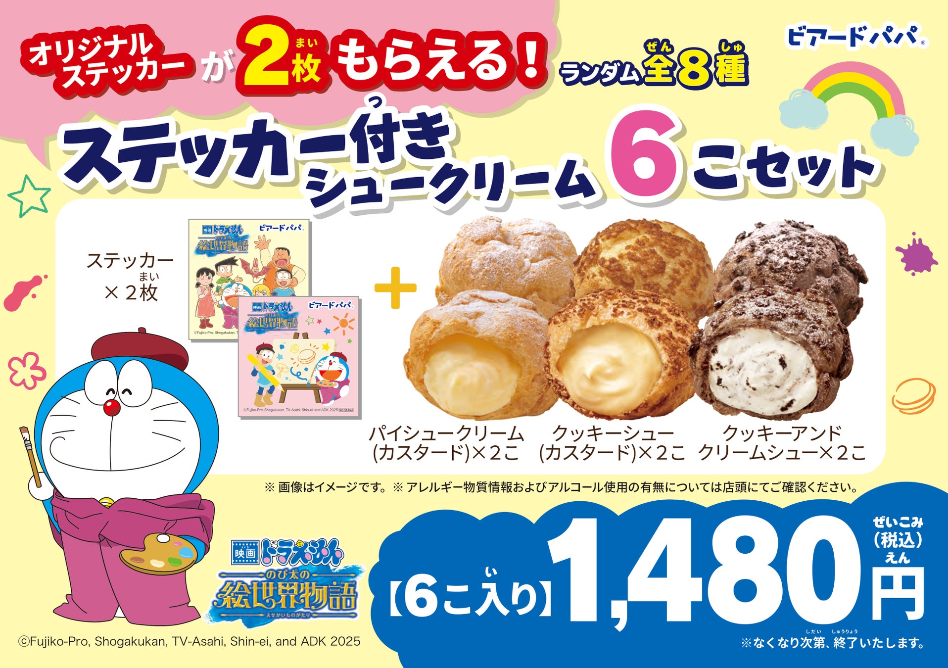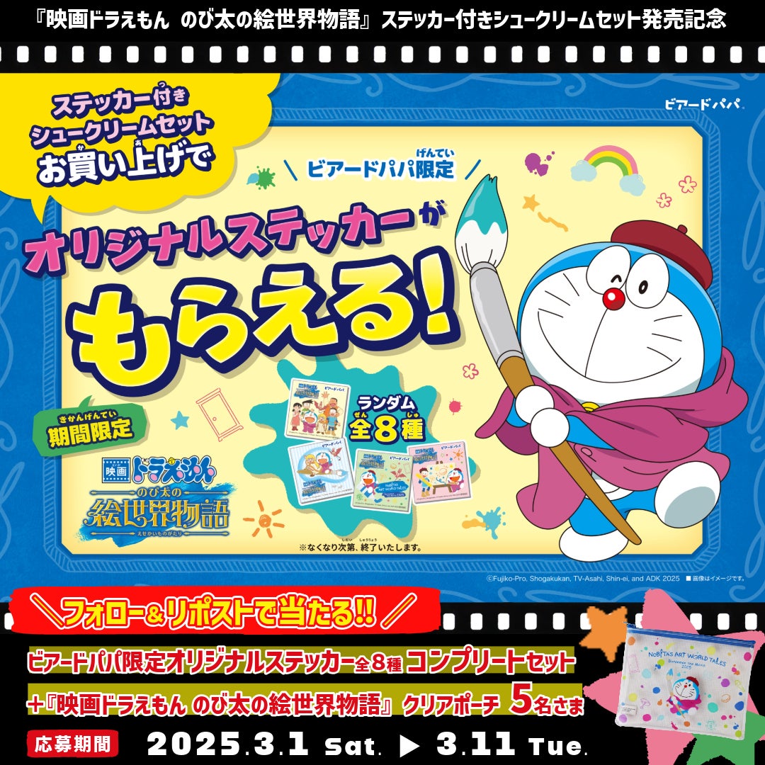 株式会社DAY TO LIFE(本社:大阪府大阪市北区、代表取締役:杉内健吉)が展開するシュークリーム専門店ビアードパパは、2025年3月1日(土)より、ビアードパパ限定『映画ドラえもん のび太の絵世界物語』のオリジナルステッカーがもらえる“ステッカー付きシュークリームセット”2種を販売いたします。数量限定のオリジナルステッカー(ランダム全8種)と、王道のパイシュークリーム(カスタード)や定番人気のクッキーシュー(カスタード)、期間限定のクッキーアンドクリームシューが入ったセットです。さらに抽選で5名様にオリジナルステッカー(全8種)コンプリートセットと映画ドラえもんのグッズが当たるXフォロー&リポストキャンペーンを開催。ご家族やお友達とご一緒にビアードパパのシュークリームをお楽しみくださいませ。