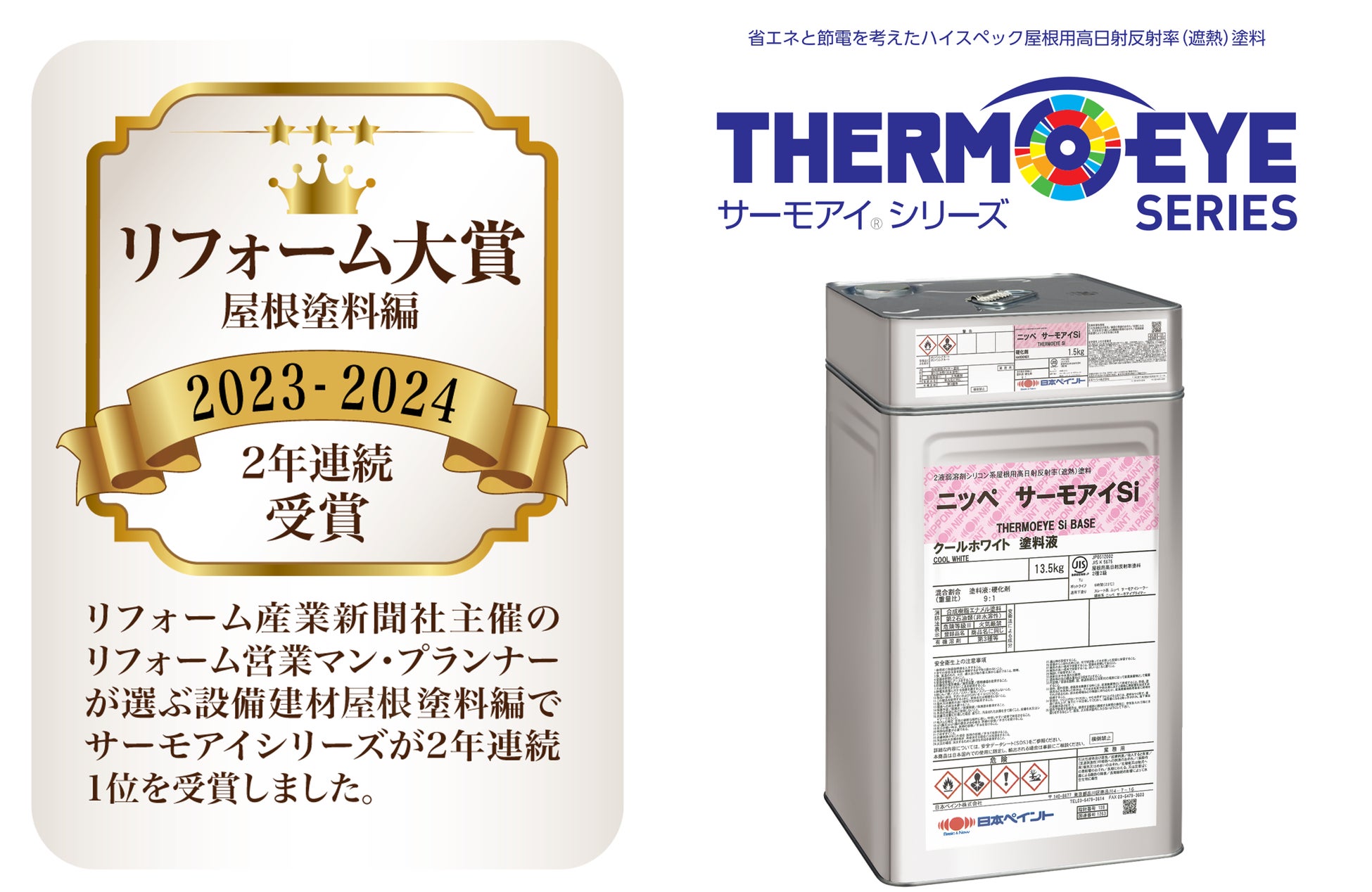 日本ペイント株式会社(本社:東京都品川区、社長:喜田益夫)が展開している「サーモアイシリーズ」が、株式会社リフォーム産業新聞社(以下、同社)によるアンケート調査「リフォーム大賞2024」において「屋根塗料ランキング2年連続1位」を獲得しましたのでお知らせいたします。
