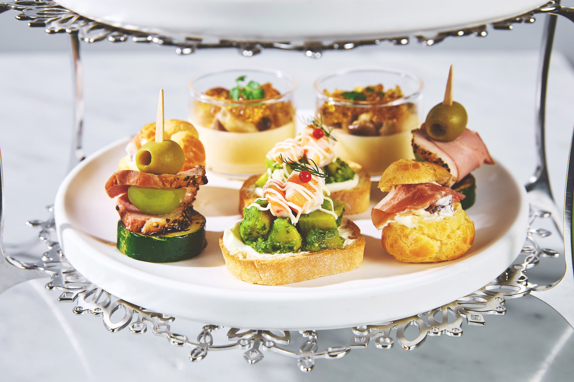 3段目:冷製キノコとコンソメのロワイヤル、海老とアボカド・バジルのタルティーヌ、生ハムとレーズンクリームのグジェール、合鴨とシャインマスカットのピンチョス