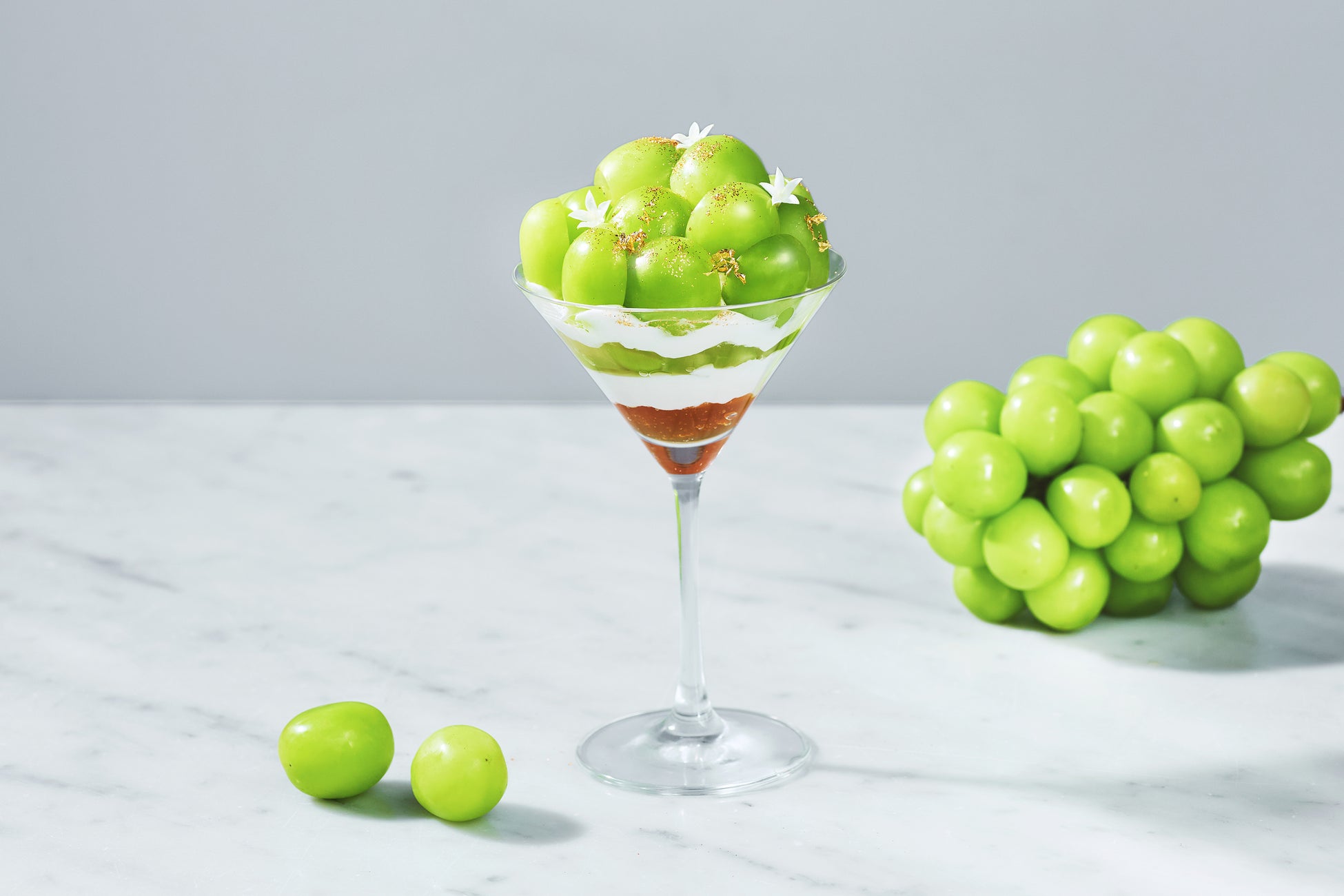旬のシャインマスカットをふんだんに使用したパフェは、シャインマスカットのパリッとした食感やみずみずしさ、フルーティーで芳醇な香りなど、素材のうまみをお楽しみいただけるよう仕上げました。グラスの中には、マスカルポーネクリームやサクサクのクッキー生地、レモンのジュレ、濃厚なバニラアイスを組み合わせ、最後の一口まで様々な味わいをお楽しみいただけます。