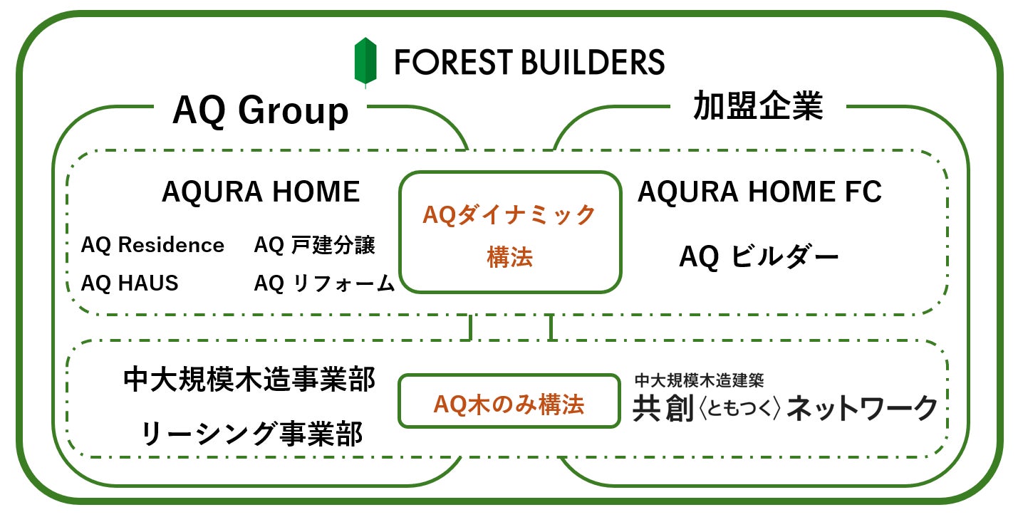 弊社は2024年に、日本最大級の木造建築集団を目指す「フォレストビルダーズ」を結成しました。「フォレストビルダーズ」には、弊社オリジナル技術「AQダイナミック構法」で戸建て住宅を建築する外部組織「アキュラホームFC」とボランタリーチェーンの「AQビルダー」があります。一方、「AQ木のみ構法」で中大規模木造建築を担う外部組織が、池田建設も所属する「ともつくネット」です。ともつくネットでは加盟企業に対し、「AQ木のみ構法」を軸とした“技術”、加盟企業同士が高め合う“場”、技術だけでなく経営を学ぶ“機会”の3つの価値を提供。技術研修、補助金申請のサポートなども含め、実務面から経営支援まで幅広くバックアップを実施することで、加盟企業が安心して中大規模木造建築を手掛けられる環境を整えています。