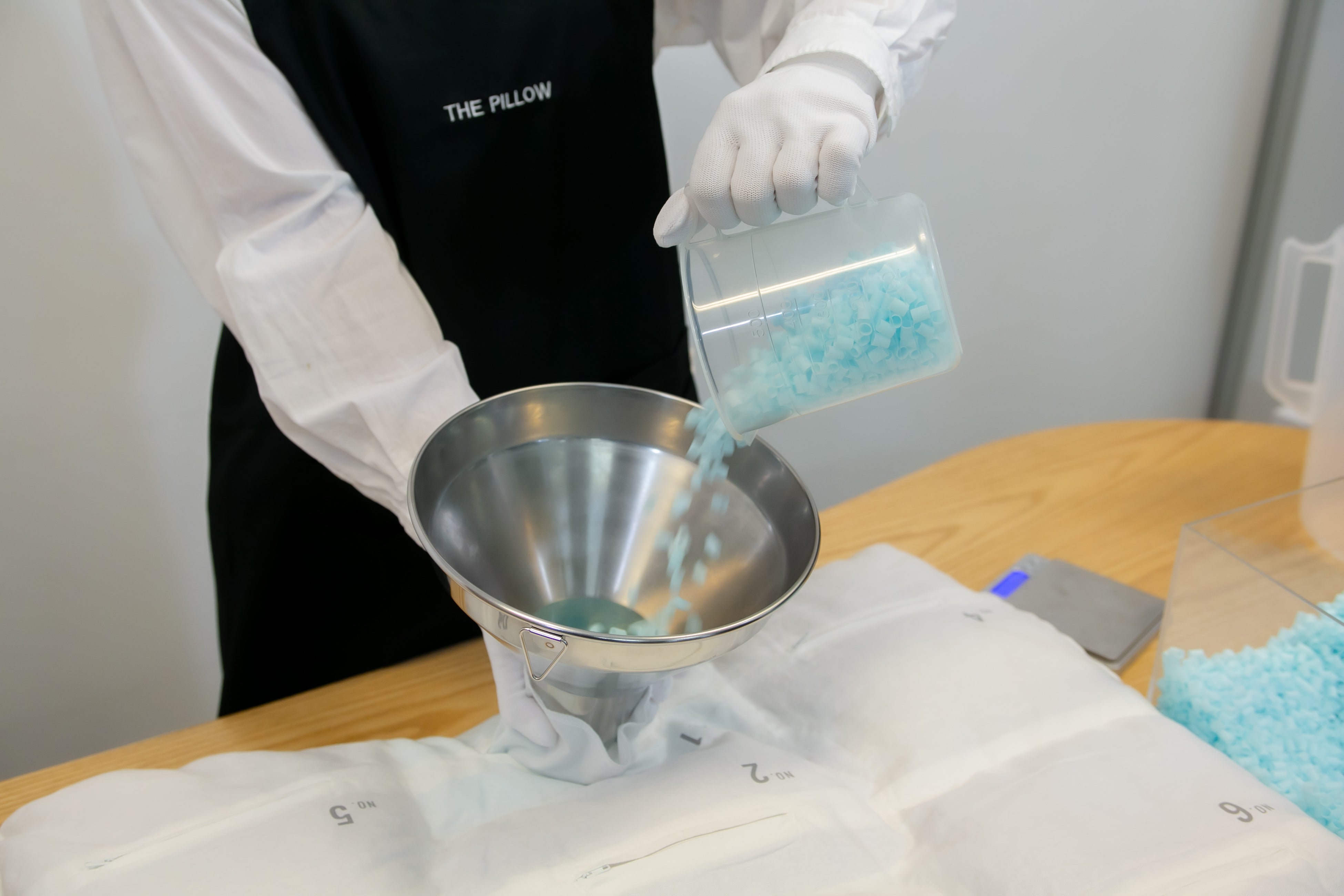 THE PILLOWは、7つのポケット(独立した部屋)に分かれた7ポケット構造の枕となっており、1つ1つのポケットが独立して、枕素材の出し入れや調節ができるようになっています。枕カルテをもとに、AIが1つ1つのポケットに最適な枕素材、最適な枕素材の容量を1g単位で計算し、70万通りの中から、あなたに最適な枕の高さ、枕の硬さ、及び枕の形状を自動提案してくれます。
