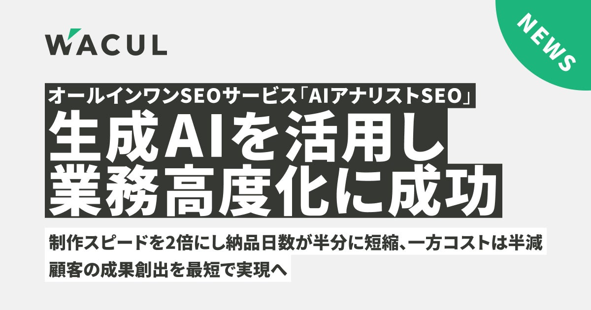 データと知見を核に、戦略から実行までマーケティングDXを一気通貫で支援する株式会社WACUL(住所:東京都千代田区、読み:ワカル、代表取締役社長:大淵 亮平、証券コード:4173、以下当社)は、SEO対策の上流から下流までをワンストップで支援するオールインワンSEOサービス「AIアナリストSEO」において生成AIを活用して「記事の構成案作成」を効率化。生成AI/ChatGPT活用第1弾「校閲ステップ」や第2弾「見出し制作」への導入に次ぐ新たな取り組みにより、記事制作スピードが2倍になり納品までの期間を半減にすることができた一方で、コスト半減化に成功。安価だが検索上位を単体では取れない「AI」と検索上位を取れるコンテンツを制作できるが高価な「人間ライター」の、最適なミックスによるコンテンツSEO制作オペレーションの構築が進展しました。