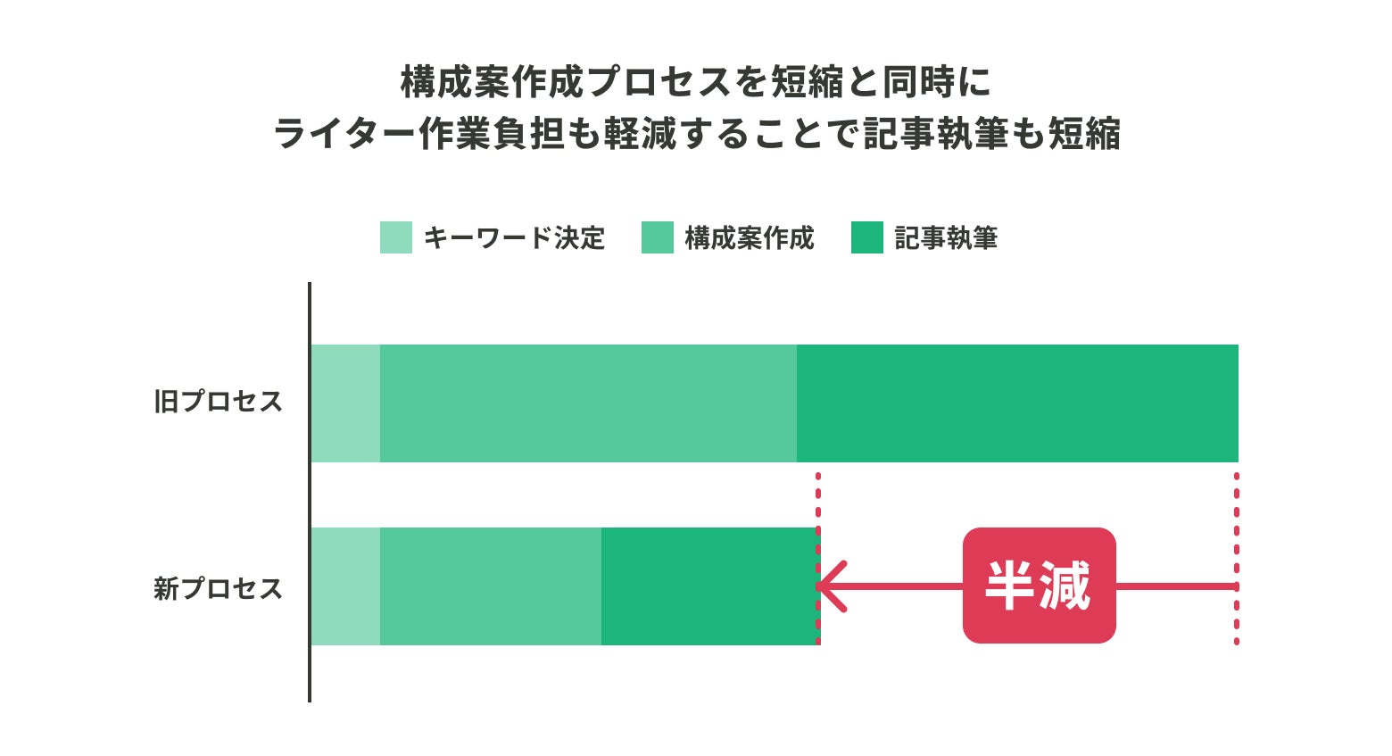 ■構成案プロセスへの生成AI導入でアウトプットクオリティはそのままに、記事制作スピードが2倍となりコストも半減