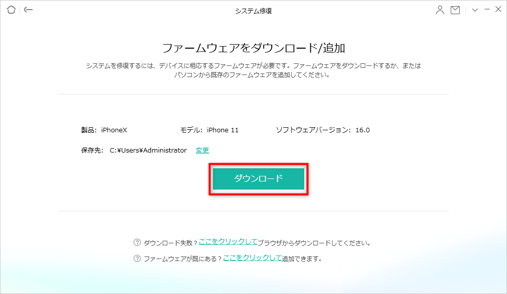 Step 4.iPhone/iPad/iPod touchのモデル情報を確認し、「ダウンロード」ボタンをクリックして修復に必要なファームウェアバッケージをダウンロードします。