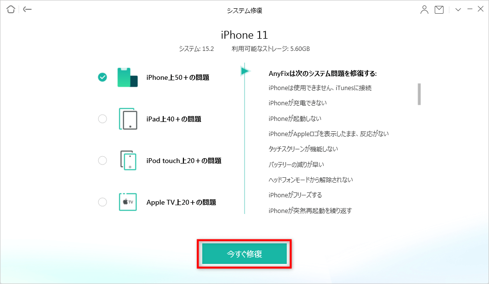 Step 3.AnyFixはiPhone上50+の問題を修復できます。「今すぐ修復」ボタンをクリックしてください。