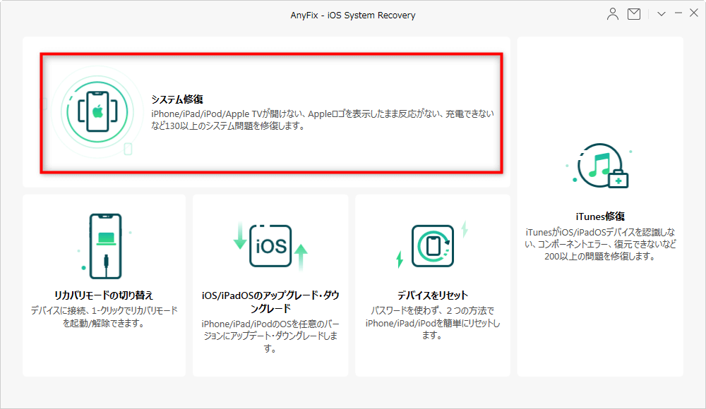 Step 2.AnyFixを起動 > USBケーブルでiPhone/iPad/iPod touchをパソコンに接続 > 「システム修復」機能をクリックします。