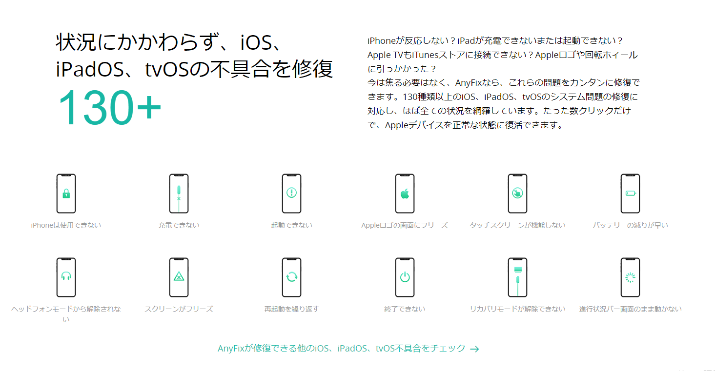 高い成功率、使いやすい機能、そしてユーザーインターフェースによって、130以上のiOS、iPadOS、tvOS不具合や他の通常のシステムの問題を修正する際に役立つことでしょう。今すぐAnyFixをダウンロードして体験してみましょう。