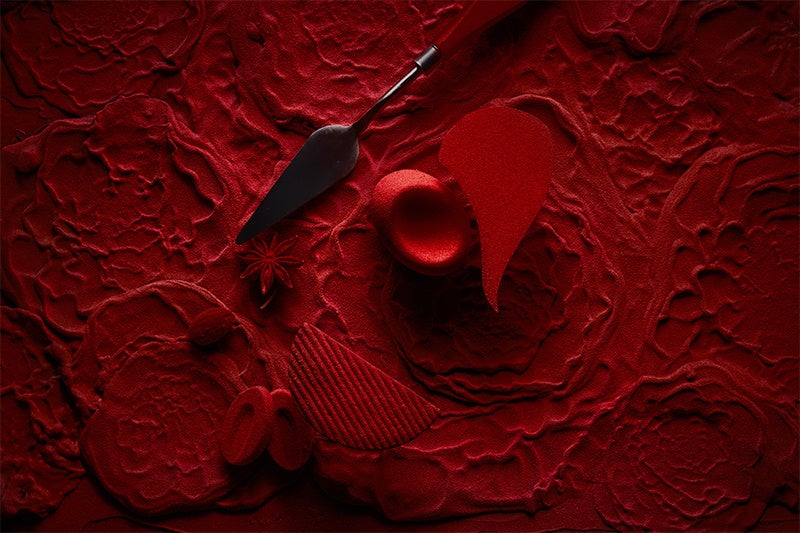 パティシエ岡澤が表現するのは、UN GRAINで初の試みとなる、焼菓子をモチーフにしたデセールです。期間限定販売のショコラの焼菓子を、デセールならではのテクスチャーや温度帯で再構築し、全く新しい味わいへと導きます。キービジュアルでも使用した「赤」をポイントとし、ショコラの彩りを表現した一皿でバレンタインの特別なひとときを演出します。召し上がった後は限定焼菓子でその余韻もお楽しみください。