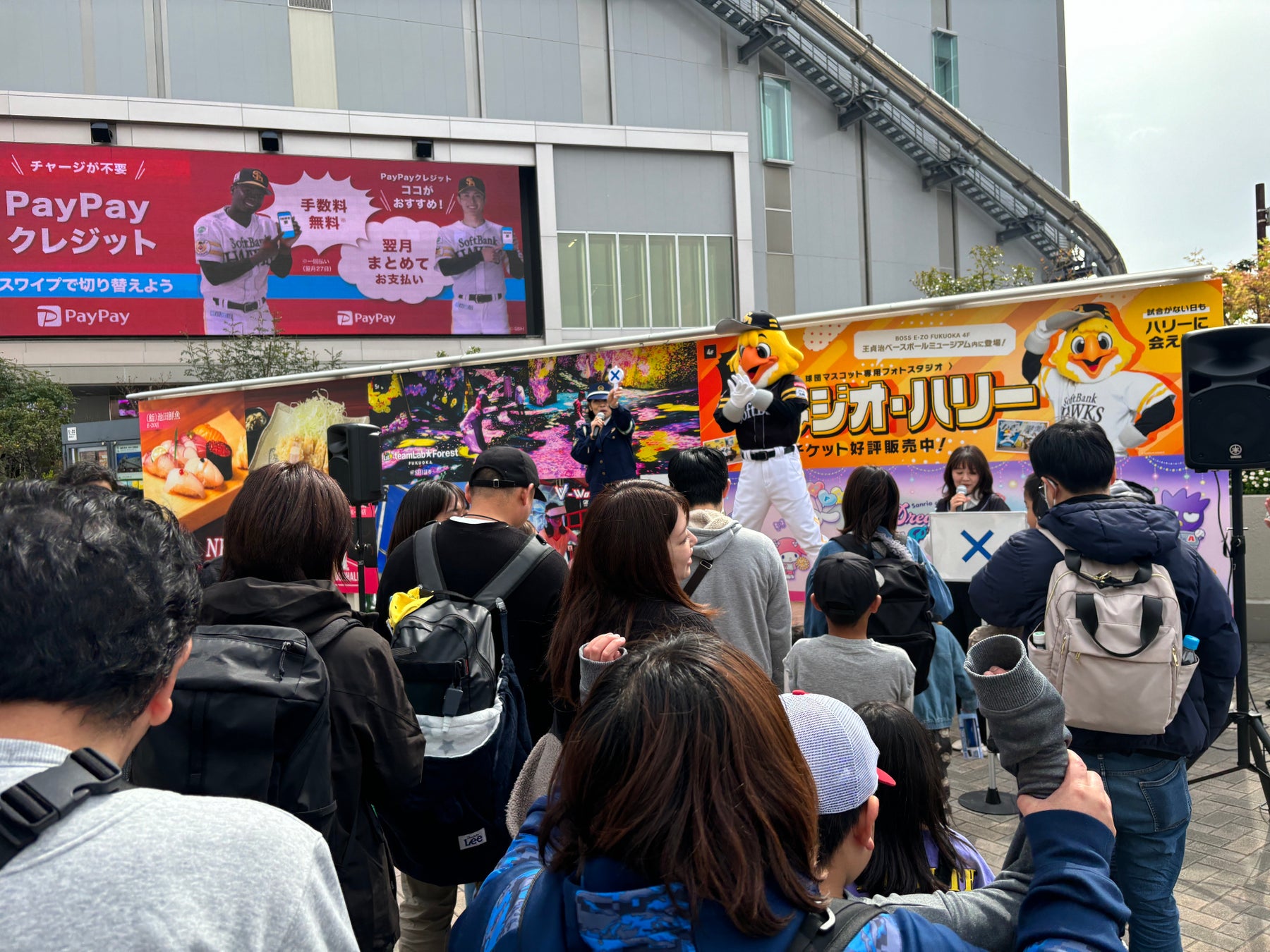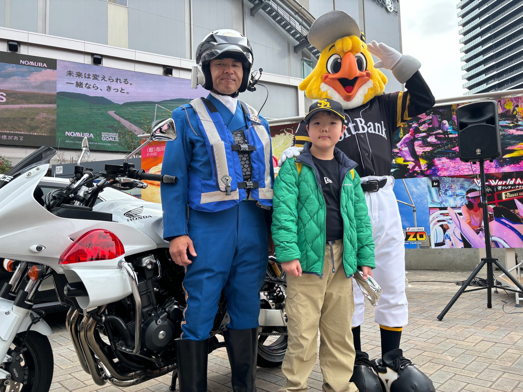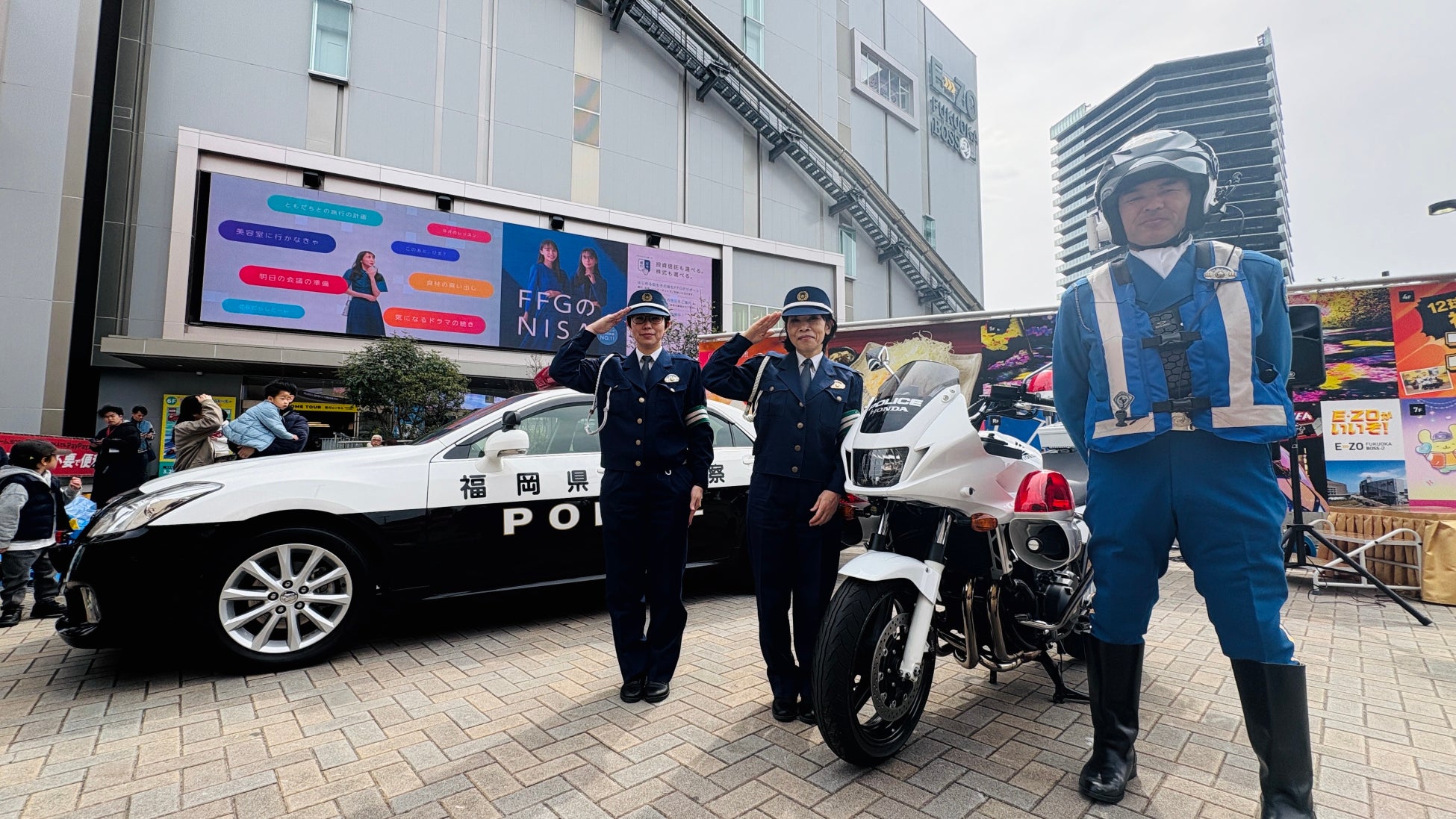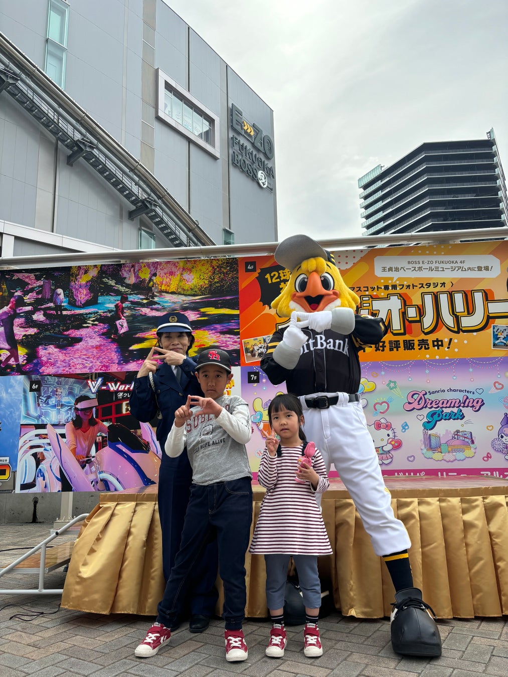 BOSS E・ZO FUKUOKA 4F「王貞治ベースボールミュージアム」で開催中(4/6(日)まで)のイベント「のりものであそぼう」にあわせて、4月5日(土)にBOSS E・ZO FUKUOKA前デッキにて、交通安全イベントを開催。4月6日(日)~15日(火)の春の全国交通安全運動の実施に伴い、福岡県中央警察署からパトカーと白バイの展示、それに加え、来場した子どもたちを対象にハリーホークと学べる交通安全クイズ大会も実施いたしました。