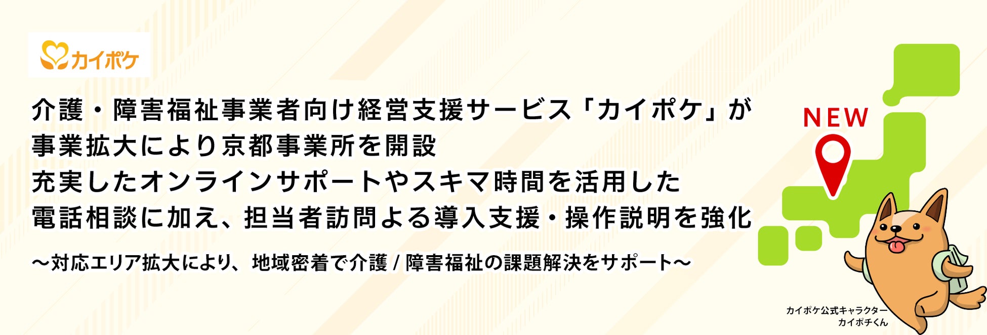 介護・障害福祉事業者向け経営支援サービス「カイポケ」が事業拡大により京都事業所を開設。充実したオンラインサポートやスキマ時間を活用した電話相談に加え、担当者訪問による導入支援・操作説明を強化