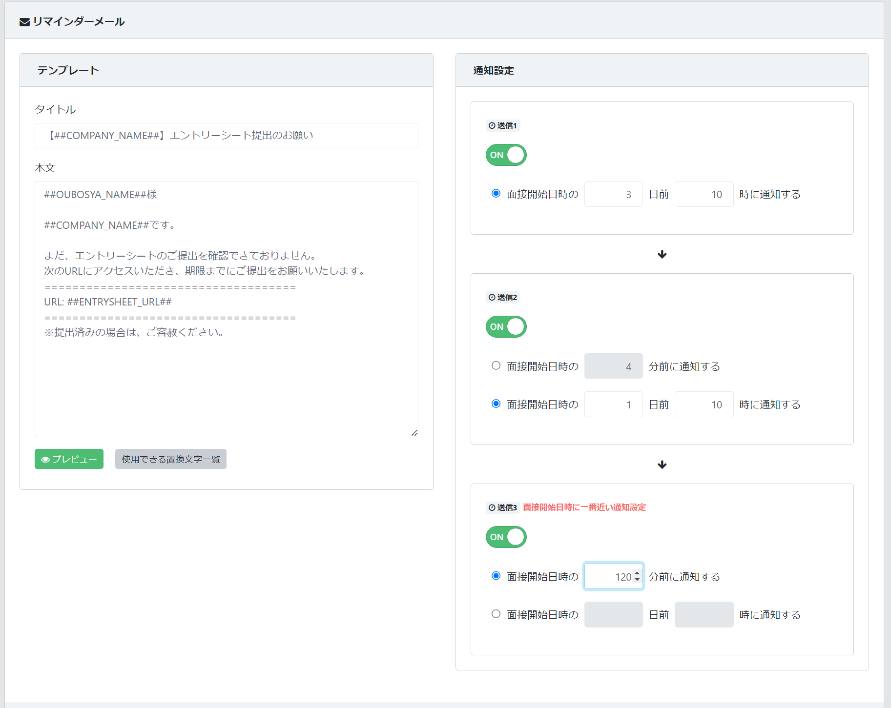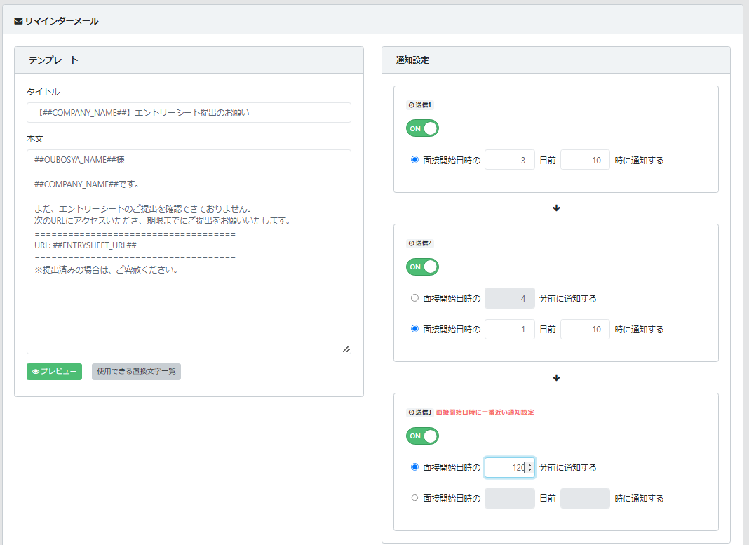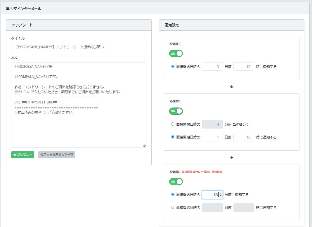 可能になります。送信タイミングは任意で設定可能です。(面接開始日時の〇〇分前または〇日前〇時に通知する)その為、提出期限に合わせて複数回のリマインダー送信設定をすることで応募者の提出忘れを防ぎ、回収率のアップが期待できます。