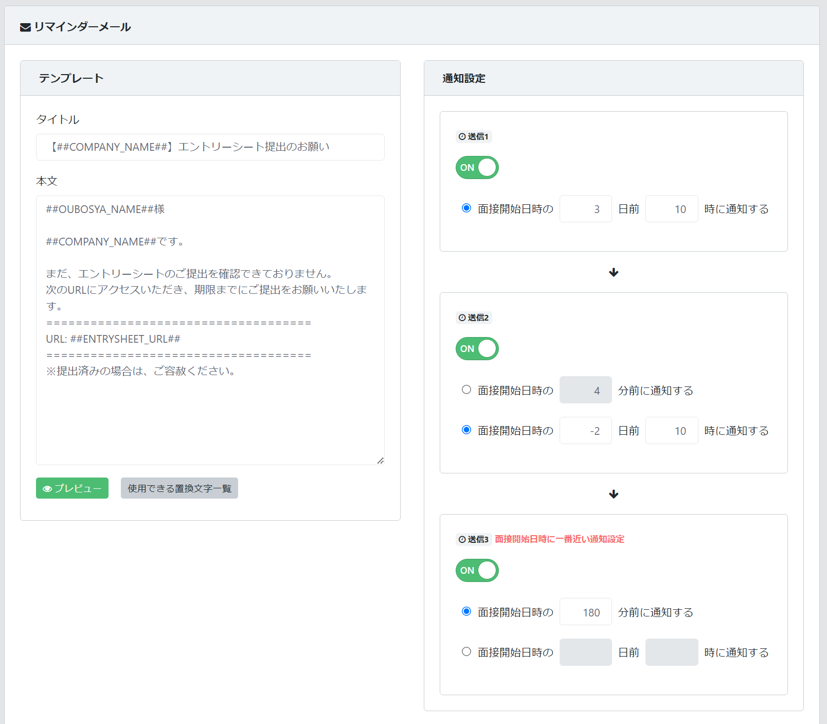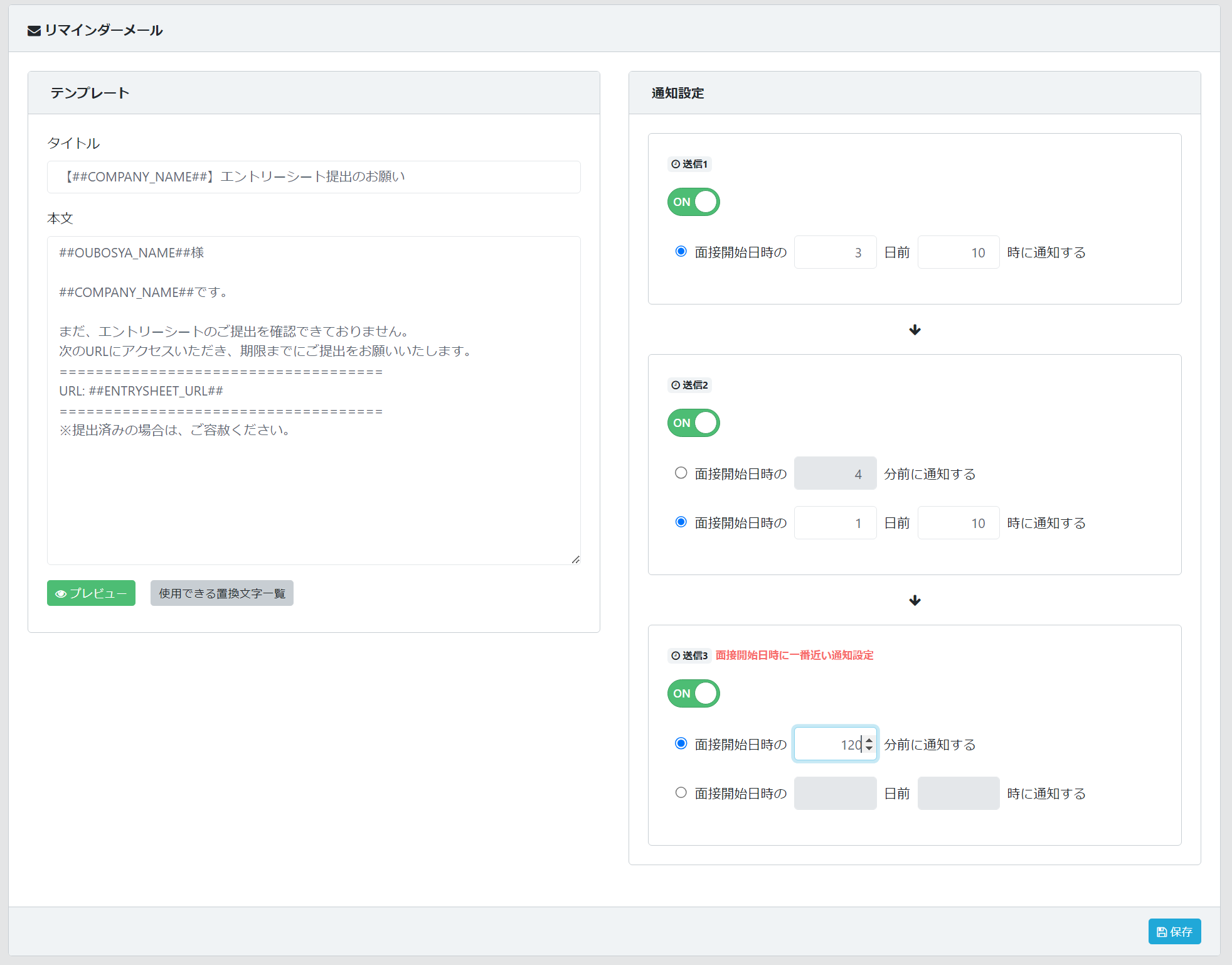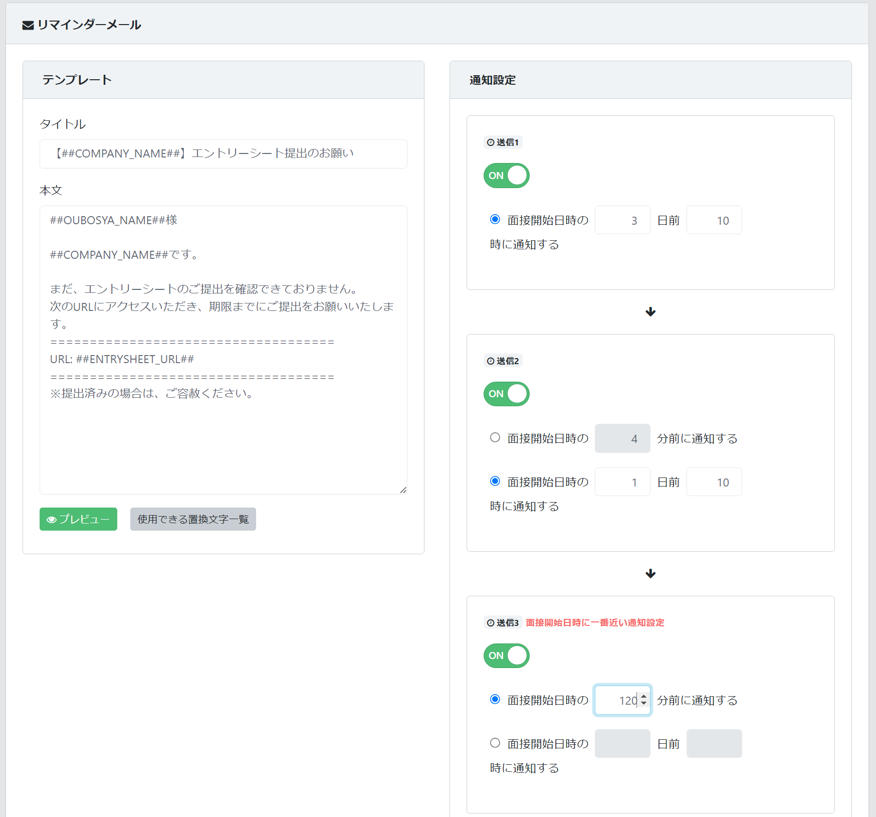可能になります。送信タイミングは任意で設定可能です。(面接開始日時の〇〇分前または〇日前〇時に通知する)その為、提出期限に合わせて複数回のリマインダー送信設定をすることで応募者の提出忘れを防ぎ、回収率のアップが期待できます。