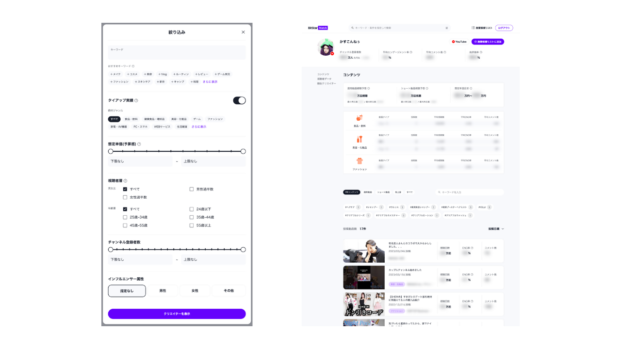 現状の「BitStar Match」では、YouTube・Instagramで活動するインフルエンサー30万人以上のデータベースを保有しています。今後は、対応プラットフォームの拡大や発注管理・効果分析などの機能を拡充していく予定です。
