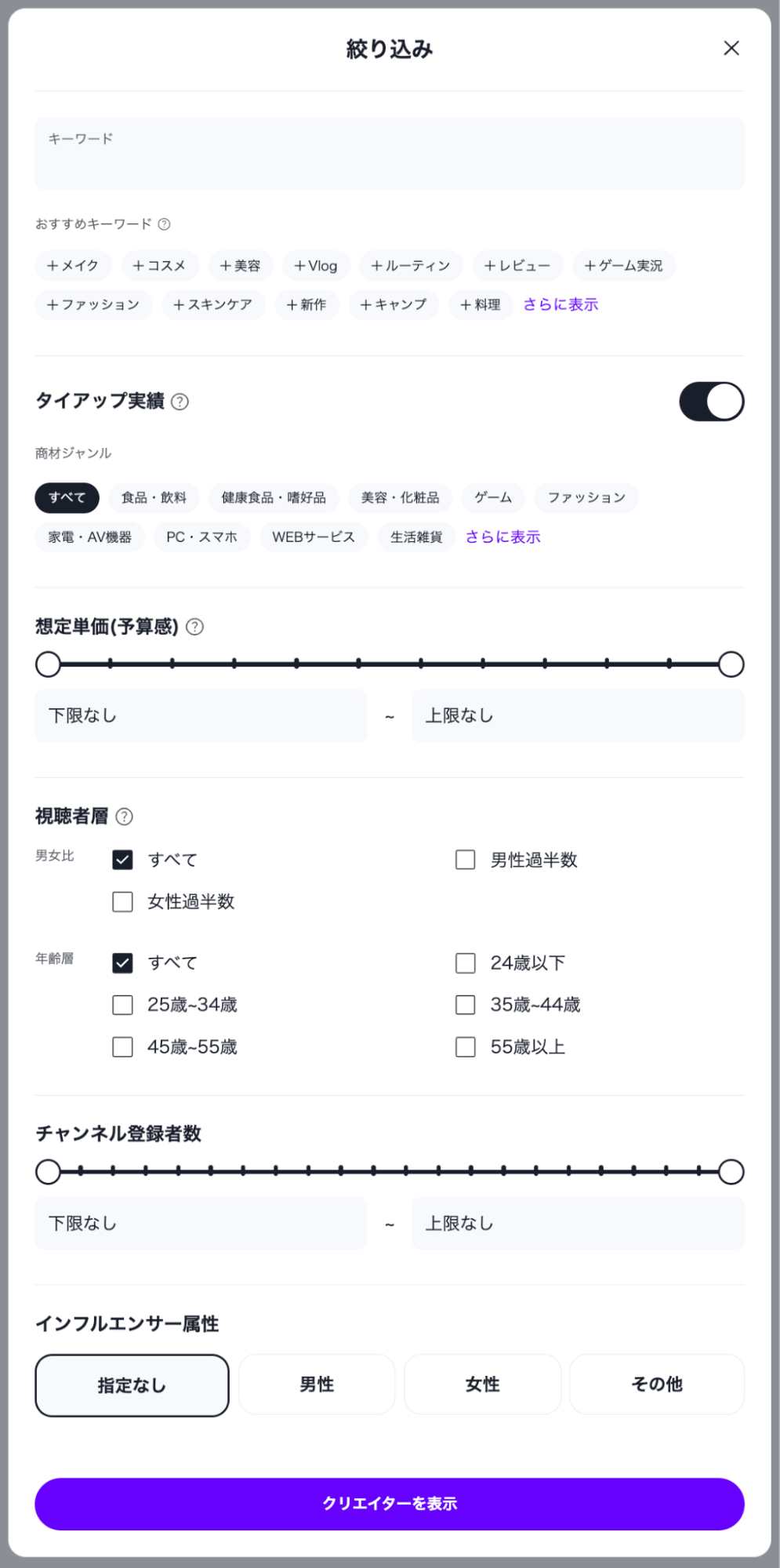 PRしたい商品やサービスに合わせて、キーワード・タイアップ実績・フォロワー数・想定単価・視聴者の性年代などを設定して検索。クリエイターの詳細ではエンゲージメント率やフォロワー数推移、タイアップ投稿の数値実績、投稿コンテンツの詳細情報などを見ながら、キャスティング候補を絞り込むことができます。