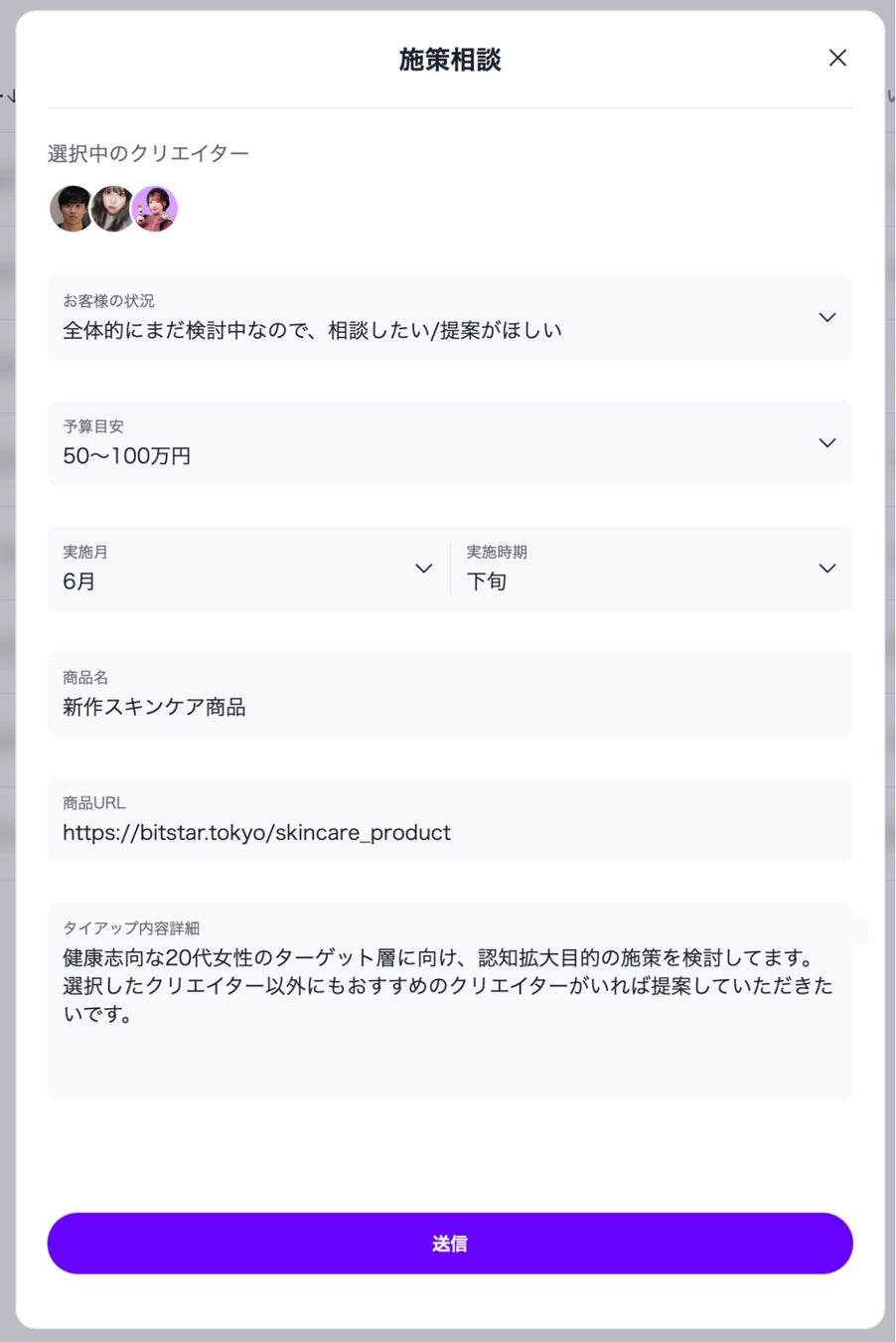 タイアップを依頼したいインフルエンサーを選択すると、その場で施策の相談を行えます。ご相談いただくと、選択したインフルエンサーの施策実施可否の確認だけでなく、追加の候補出しや施策全般に関するアドバイスなどBitStarの担当者が幅広く迅速にご対応します。