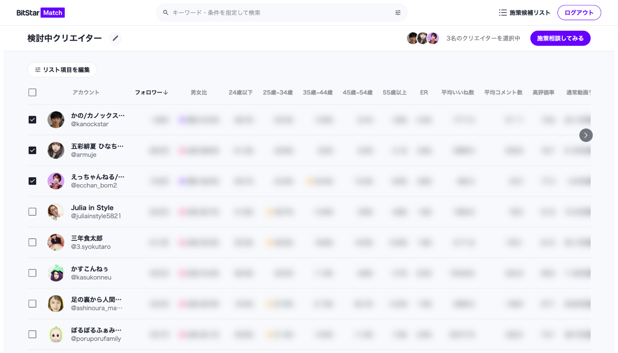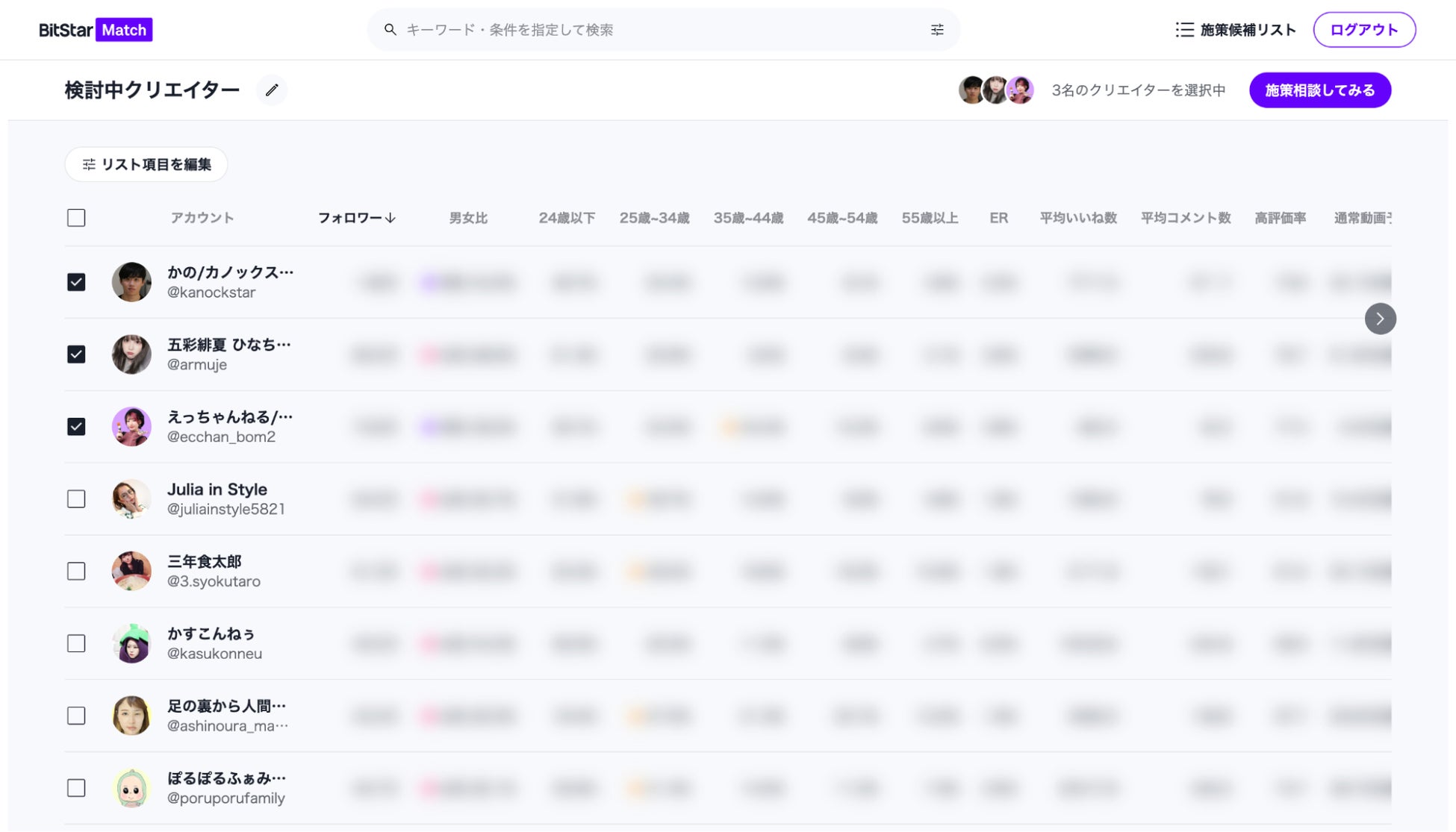 候補のインフルエンサーは、施策候補リストで一元管理。インフルエンサーの各種数値を並び替えなどを行いながら比較し、候補を精査していくことができます。