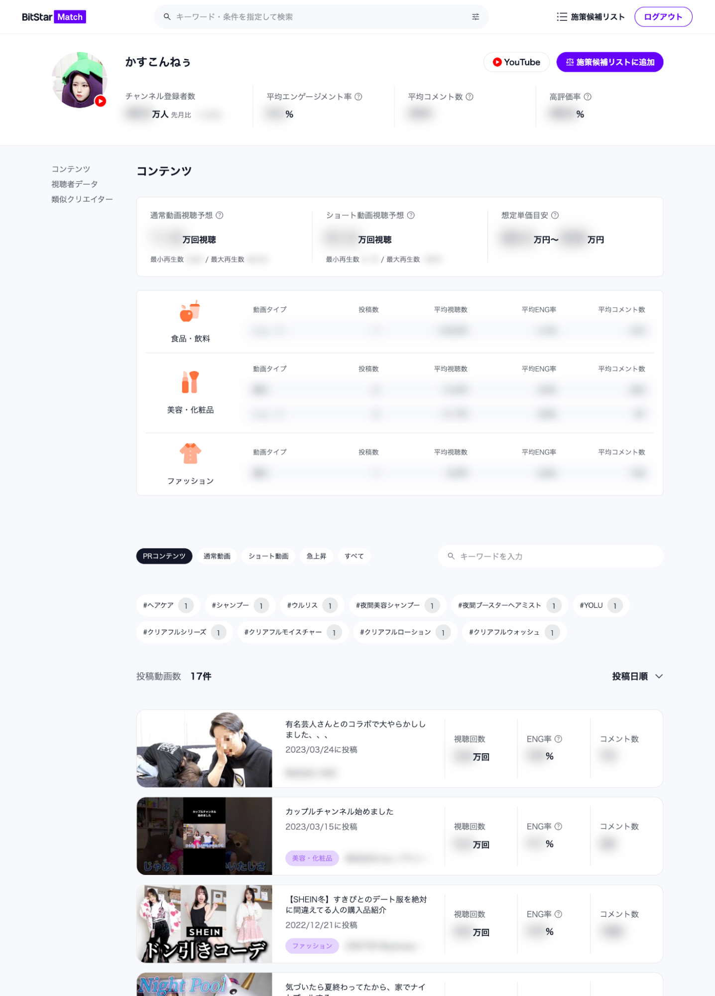 「BitStar Match」では、企業のマーケティング担当者自らが商品やサービスにマッチしたインフルエンサーを簡単に探すことができます。YouTube・Instagramにて30万人以上のデータベースから、タイアップ実績・フォロワー数・想定単価・視聴者の性年代などのフィルタリングをかけて、候補となるインフルエンサーを絞り込むことが可能です。候補となったインフルエンサーはリストで管理し、エンゲージメント率などの数値はもちろんのこと、過去のPR投稿内容や投稿へのコメントの傾向などを参考に比較できます。施策を検討したいインフルエンサーが見つかれば、ボタン1つで施策の相談を行えます。