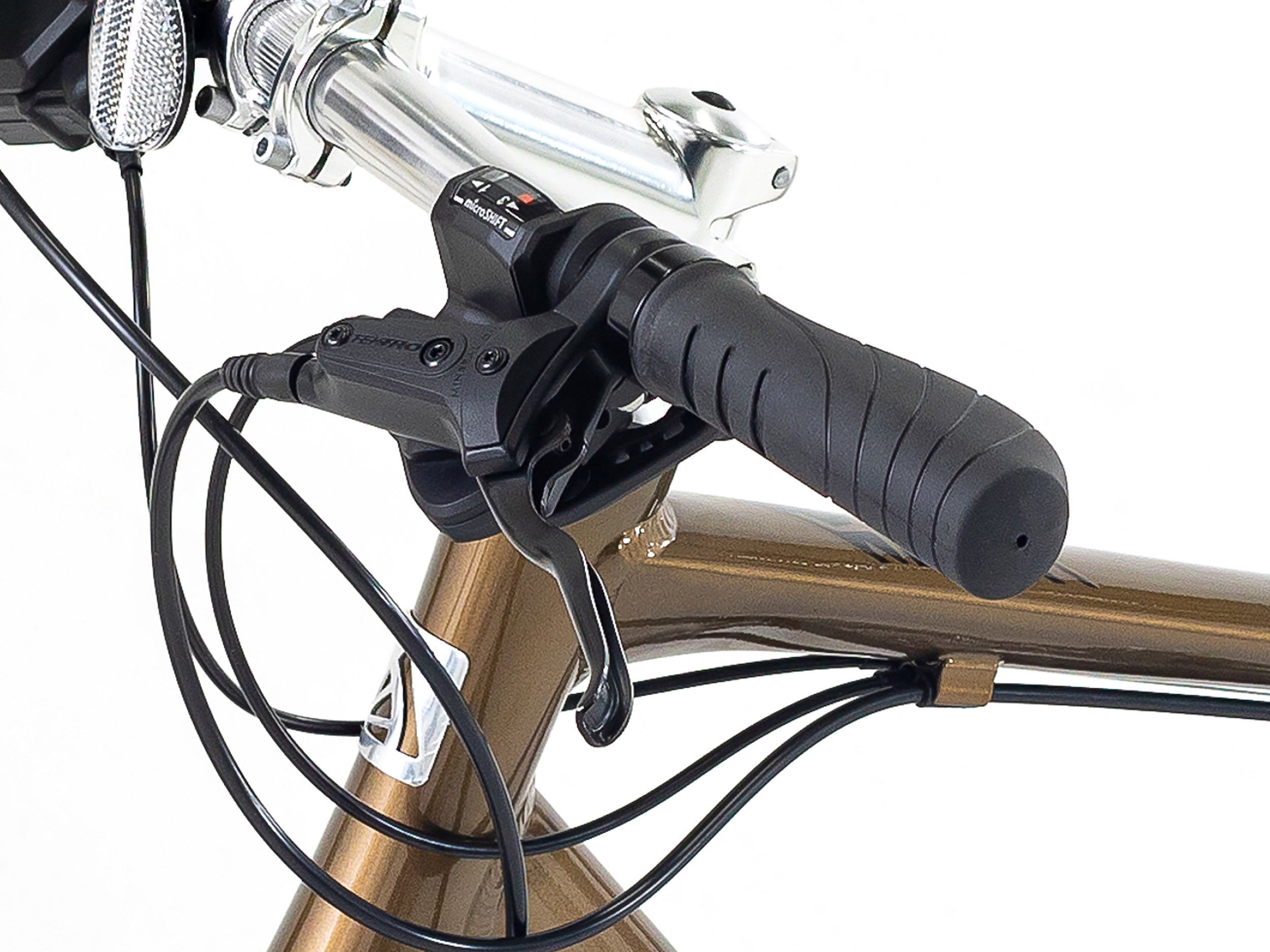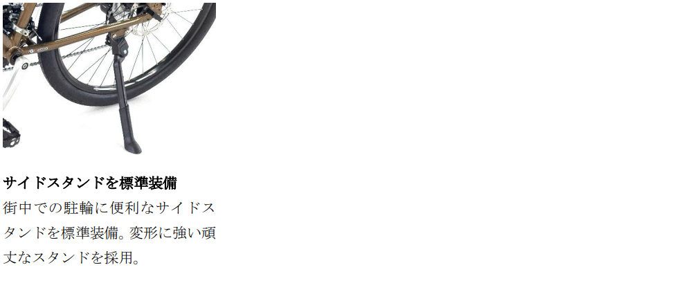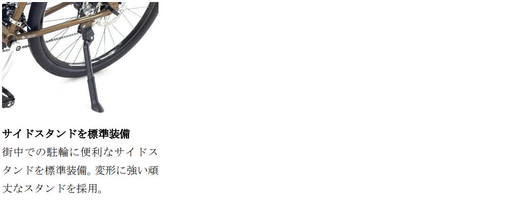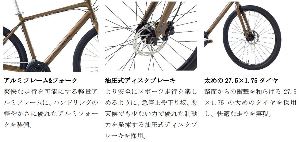 スポーティな走りを楽しんでいただけるように、フレームとフロントフォークには軽量なアルミ素材を採用。快適性を高めるために、体に直接触れるサドルやグリップには幅広でクッション性の高いエルゴノミックグリップやコンフォートサドルを採用しているほか、路面からの衝撃を和らげる27.5×1.75サイズの太めのタイヤを装備しています。安全面では、急停止や下り坂、悪天候でも少ない力で確実な制動力を発揮する油圧ディスクブレーキを採用。さらに、日常使いに便利なサイドスタンドも標準装備したバランスの良い一台です。