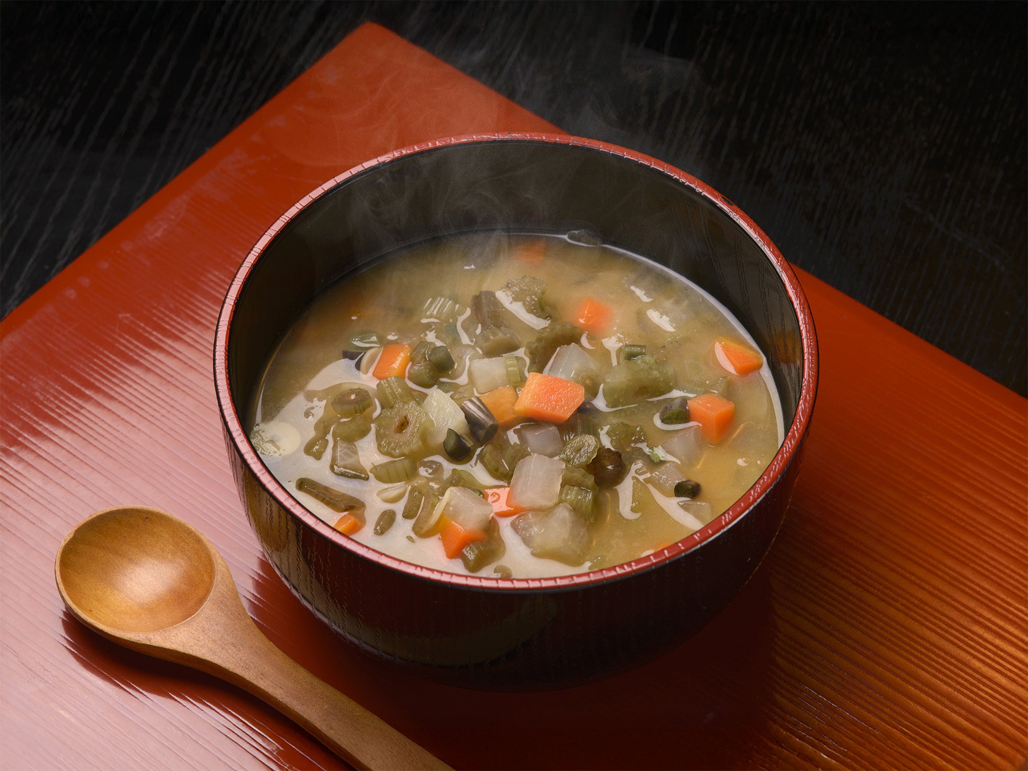 青森らしいほっと温まる味わいで、チェックインのお客様をお迎えいたします。青森の地酒「田酒」を使ったホテル特製の甘酒は、冷えた体を芯から温めます。青森の代表的な郷土料理の「けの汁」は、根菜や山菜、凍り豆腐などを細かく刻んで煮込んだ栄養満点な一品です。寒い季節にぴったりな、青森らしいメニューでおもてなしいたします。