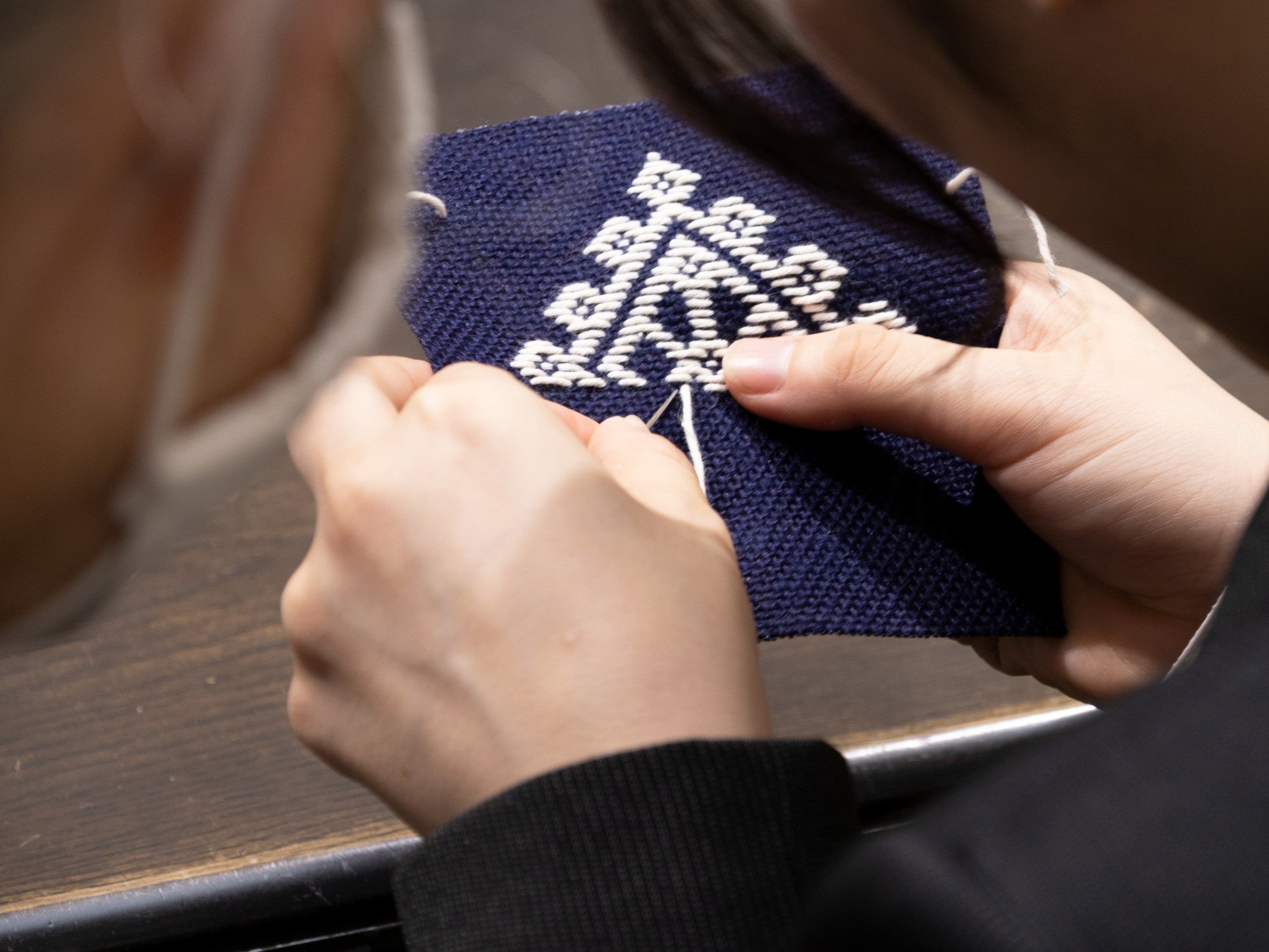 青森県津軽地方に伝わる伝統刺繍「津軽こぎん刺し」は、かつて麻の服しか着ることができなかった津軽の農民が、冬の厳しい寒さから身を守る補強のために生み出したとされています。細かい幾何学模様を一針一針丁寧に刺していくことで、布に美しい文様が浮かび上がります。体験では、プロの刺し子の教えのもと、コースターやしおりなどへの模様付けを楽しめます。