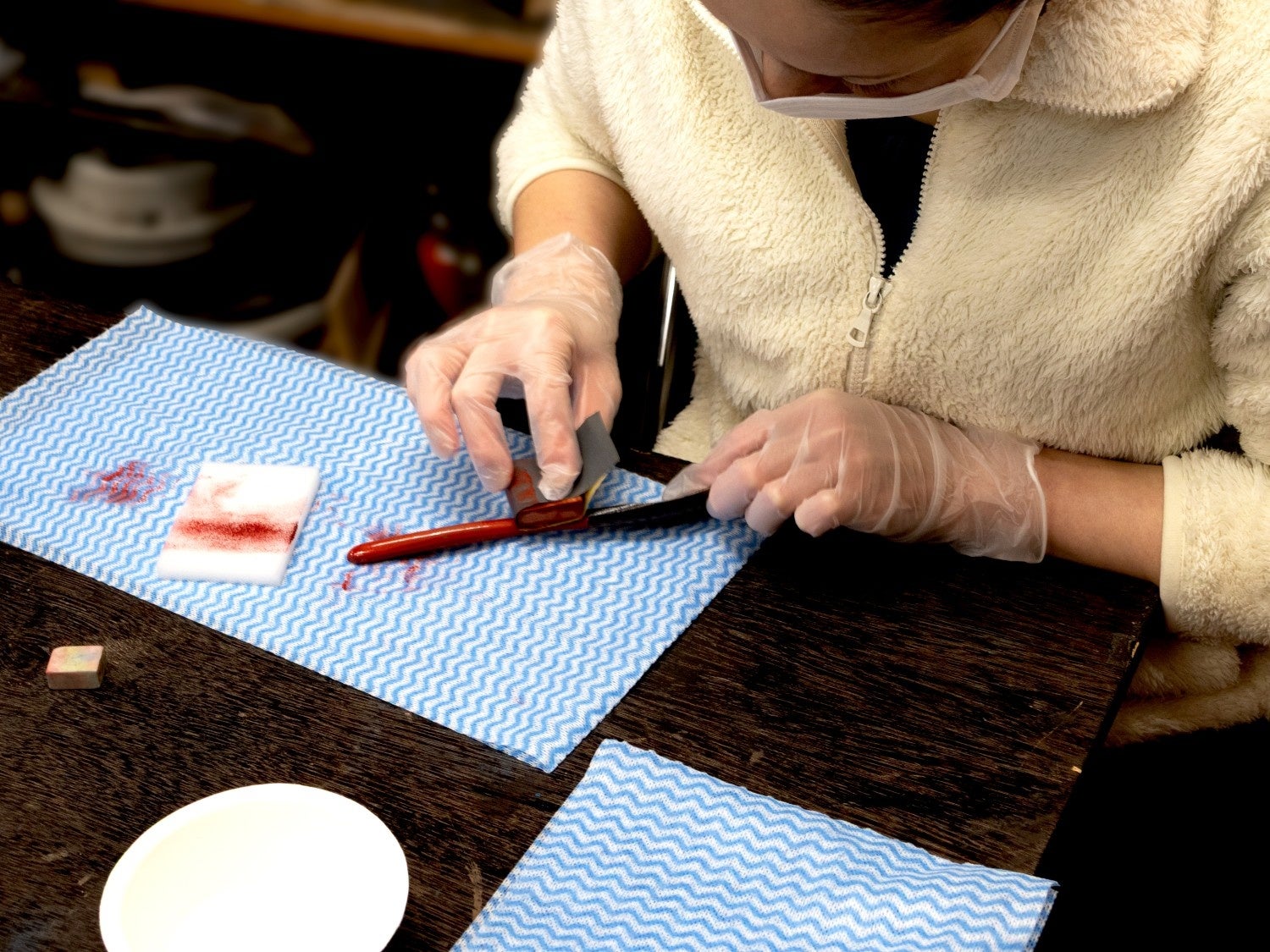 津軽塗の「研ぎ出し」は、凹凸のある素材に幾重にも塗り重ねた漆を平滑に研ぐことにより、模様を作り出す伝統的な技法です。体験では、箸と匙のどちらかをお選びいただき、研ぎ出す場所や力加減により、オリジナルの津軽塗作品が完成します。作品は当日お持ち帰りいただけるほか、後日ご自宅に郵送する艶出し加工のオプションもご用意しています。