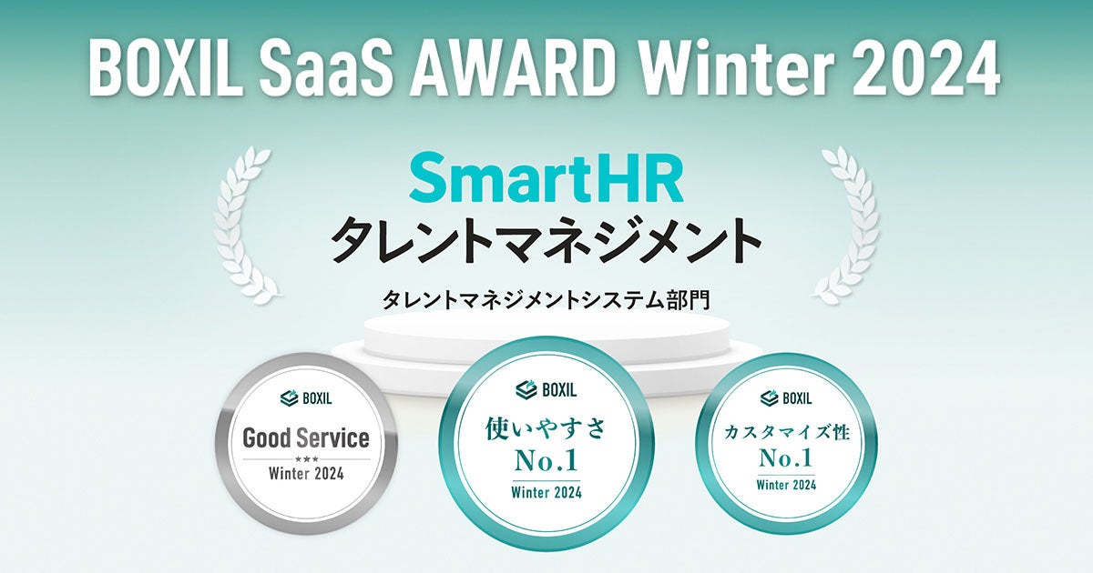 株式会社SmartHR(本社:東京都港区、代表取締役CEO:芹澤 雅人、以下「当社」)が提供するクラウド人事労務ソフト「SmartHRタレントマネジメント」は、スマートキャンプ株式会社(以下「スマートキャンプ」)が主催する「BOXIL SaaS AWARD Winter 2024」のタレントマネジメントシステム部門で「使いやすさNo.1」に選出されました。