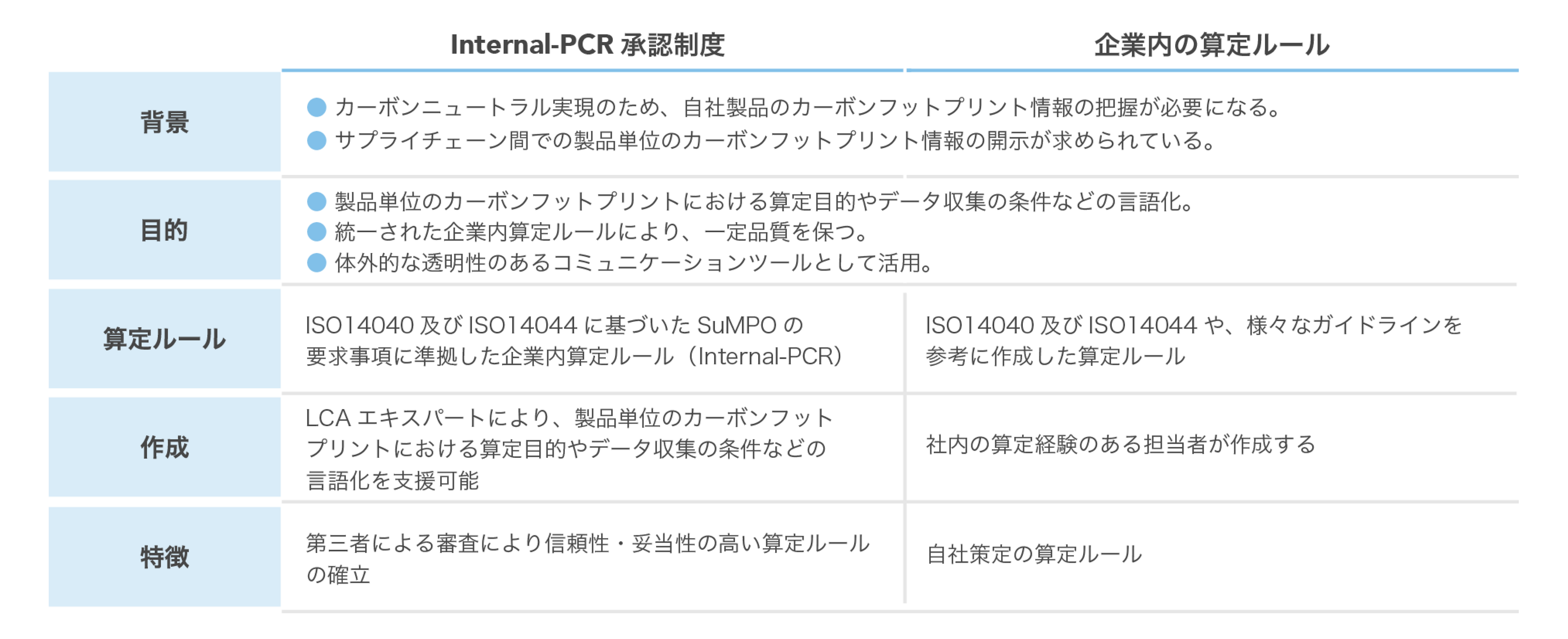 Internal-PCRとは、PCR(Product Category Rules:特定の製品カテゴリーに関するカーボンフットプリント*等の算定やコミュニケーションに関するルール)のうち企業内で用いられることを想定して作成されたものを指します。「SuMPO/Internal-PCR承認制度」の目的は、信頼性と妥当性の高いInternal-PCRを構築・運用することにより、カーボンニュートラルへ向かうための自社製品の環境情報の可視化と環境情報であるカーボンフットプリントを用いた社内外コミュニケーションの促進に活用いただくことです。