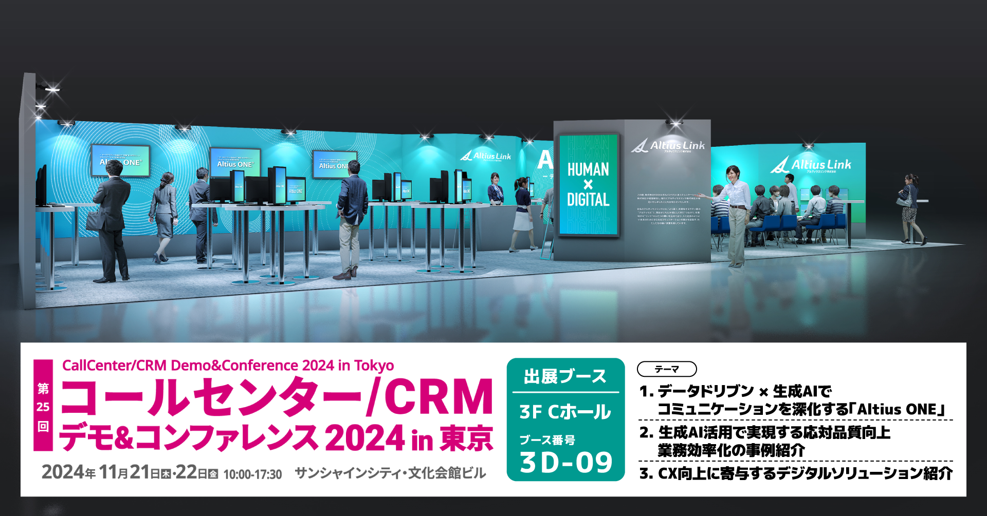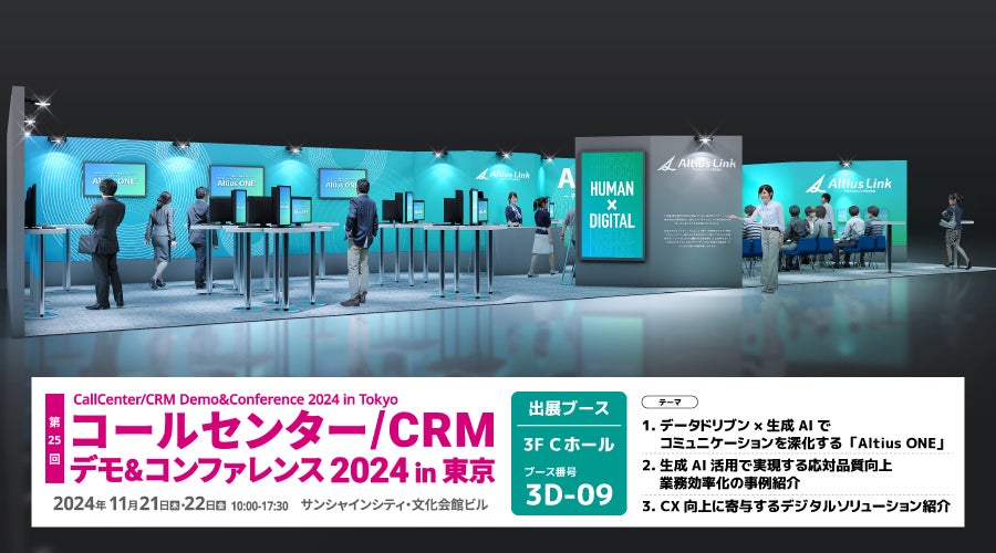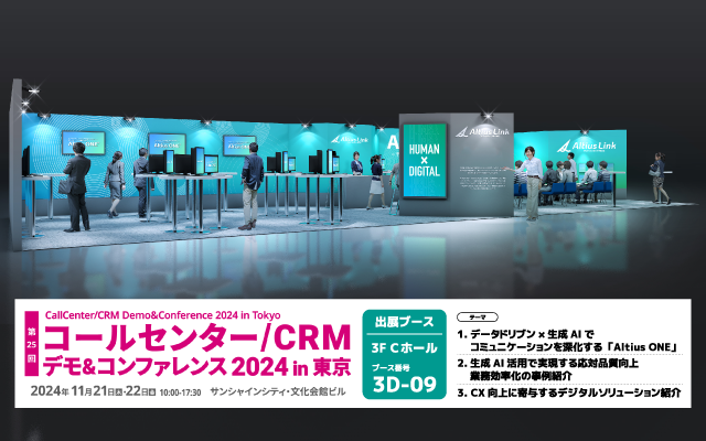 アルティウスリンク株式会社(所在地:東京都渋谷区、代表取締役社長:網野 孝、以下 アルティウスリンク)は、2024年11月21日(木)・22(金)に開催される「コールセンター/CRMデモ&コンファレンス2024 in東京」に出展します。