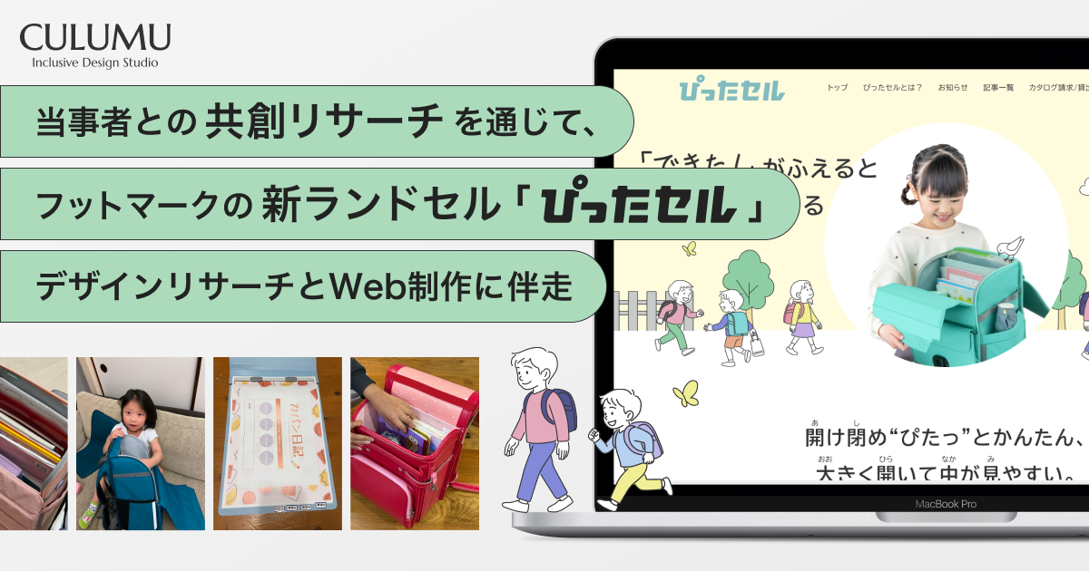 株式会社STYZ(本社:東京都渋谷区、代表取締役:田中辰也)が運営するインクルーシブデザインスタジオ「CULUMU(クルム)」は、フットマーク株式会社(本社:東京都墨田区、代表取締役社長:磯部徳史、以下 フットマーク)が2026年4月に発売する新しいランドセルリュック『ぴったセル』のプロジェクトにおいて、開発に向けたインクルーシブリサーチ、および公式Webサイト制作に伴走支援いたしました。