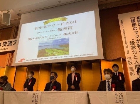 この度、瀬戸内ゴルフリゾートは、備後地域商工会議所管内の会員事業所で、優れたアイデアや商品、技術、サービス、またはその提供方法に著しい新規性を有する事業を展開し、将来にわたり大きく発展が期待される企業として、新事業アワード2021(商業・サービス業部門)で優秀賞を受賞しました。表彰式は、令和4年2月22日(火)に開催予定の第12回ビジネス交流フェア(主催:福山商工会議所/場所:福山ニューキャッスルホテル3階「光耀」)内で行われました。