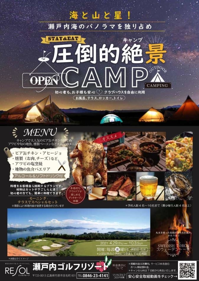 全コースから瀬戸内海が見晴らせる絶景のリゾートコース。ゴルファー以外の方にもお気軽にお越しいただくように昨年からキャンプ企画を実施。瀬戸内海の大パノラマと気持ちの良い芝生による大空間で癒しと感動の極上キャンプがご堪能いただけます。初心者の方でも道具一式が揃った『手ぶらで楽々コース』(調理器具、テント、寝袋、マット、ランタン、焚火台、キャンプ用コンロ、防火シート、スウェーデントーチ付)があるので安心。ゴルフ場ならではのクラブハウス内の綺麗なトイレや瀬戸内海一望の大浴場が無料で利用できるのもポイント。レンタルクラブや練習場も無料で開放しており、はじめてのゴルフ体験をされたい方にはまたとない機会になります。