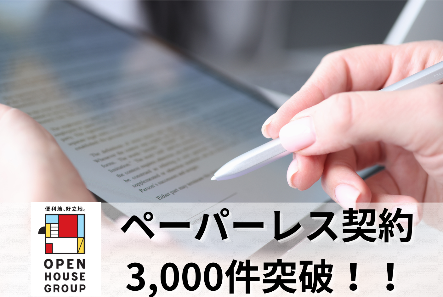 株式会社オープンハウスグループ(本社 東京都千代田区、代表取締役社長 荒井正昭、以下「当社」)のグループ会社において「ペーパーレス契約」の実績が累計で3000件を突破したことをお知らせいたします。
