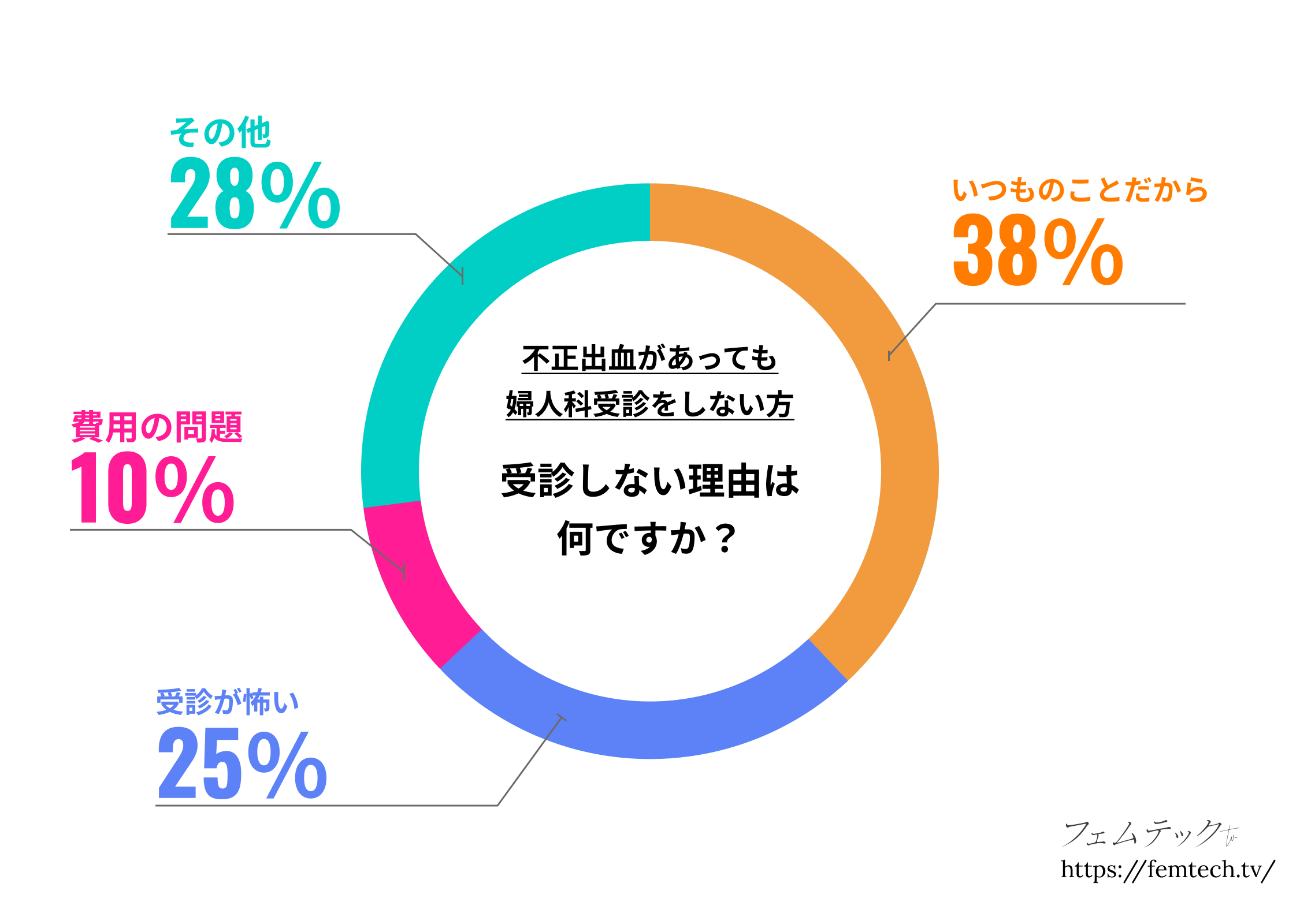 約半数が「不正出血があっても婦人科を受診していない」という結果に。その理由として「いつものことだから」38%、「受診が怖い」25%、「費用の問題」10%、そのほかの理由として、「様子を見たかった」「行く時間がない」、「生理かと思った」、「出血中の受診を断られた」などが挙げられました。
