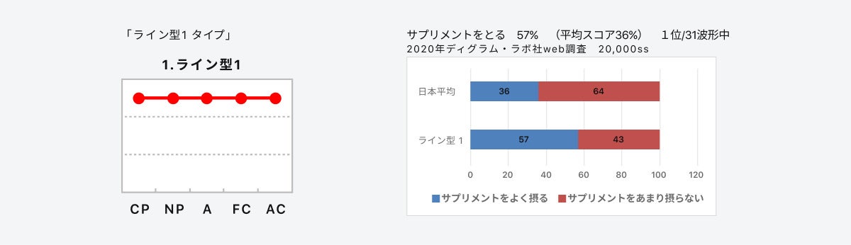 ディグラム・ラボ社の31の性格パターンから、「ライン型1タイプ」では「サプリメントをよくとる」という結果が得られていますが、それをFiNC社が食事記録データを用いて、さらに細分化し分析したコンテンツです。性格に合わせた食事摂取傾向を把握し、FiNC社の食事アドバイスと企業の広告向けコンテンツに活かしてまいります。