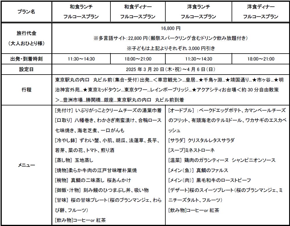 WILLER EXPRESS株式会社(本社:東京都江東区、代表取締役:平山幸司、以下「ウィラーエクスプレス」)は、2025年3月20日(木・祝)~4月6日(日)の春限定コースとして、東京レストランバスの『心に贅沢な、桜花見コース』(以下、本コース)を実施します。それに先駆け、本日1月30日(木)よりレストランバス公式Instagram(https://www.instagram.com/restaurantbus_willer/?hl=ja)にて先行予約を開始し、2月6日(木)11:00より予約サイト「WILLER TRAVEL」の日本語版サイト(https://travel.willer.co.jp/restaurantbus/tokyo/)と英語・簡体字・繁体字の多言語サイトにて予約を開始します。