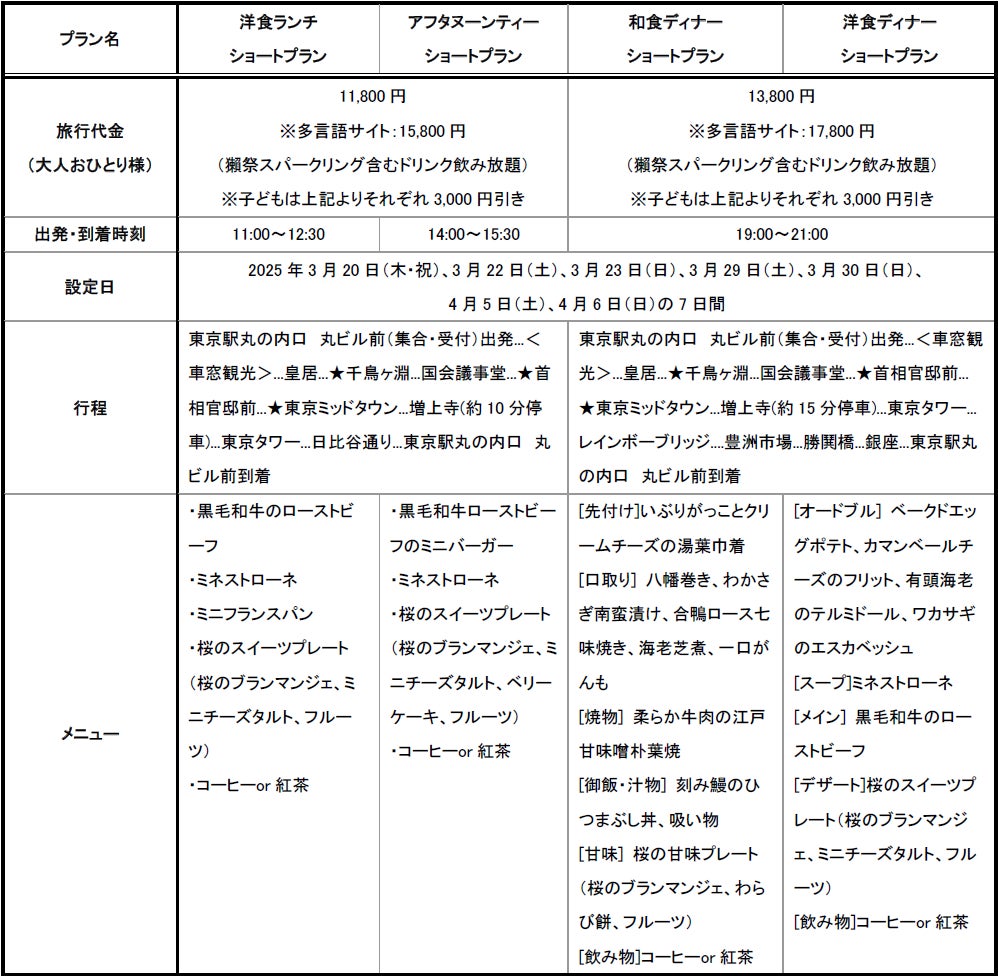 本コースでは、人込みの中で鑑賞するお花見ではなく、東京レストランバスで桜の名所を巡り、車窓から優雅に桜を眺めながら贅沢な食事とお酒(※1)を楽しむ、特別なお花見体験をご提供します。今回は、例年好評の3時間かけてたっぷりお楽しみいただけるプランに加え、忙しい方や隙間時間でもお花見を楽しみたいという方にもお勧めな、1時間30分~2時間で気軽にお楽しみいただける「ショートプラン」を新設しました。さらに、食事は、春の食材などを使用しお花見仕様にアレンジした和食・洋食の本格的なコース料理に加え、アフタヌーンティーを楽しむプランも登場します。いずれも、お花見の優雅なひとときがさらに盛り上がる内容に仕上がっています。