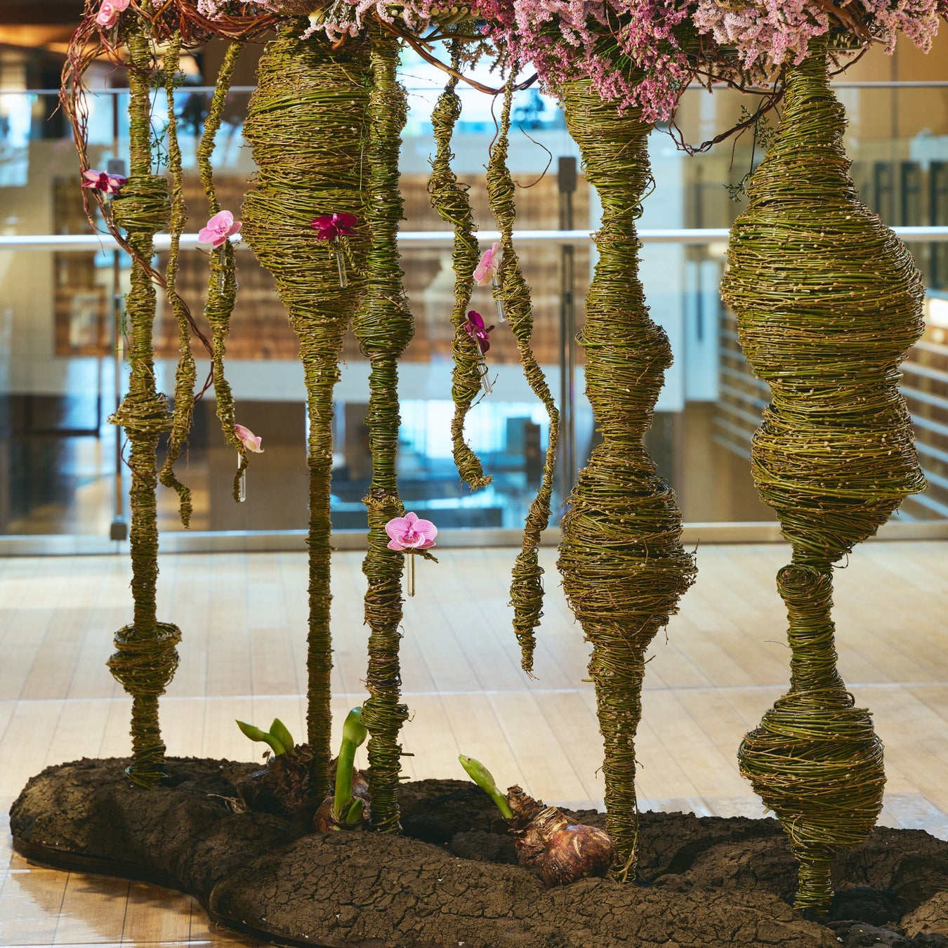 一度変化すると二度と元の状態には戻らない。時間の経過とともに失われながらも、新たな姿へと更新されていく生命の儚さと刹那的な美しさを、花と構造によって立体的に表現した作品です。
