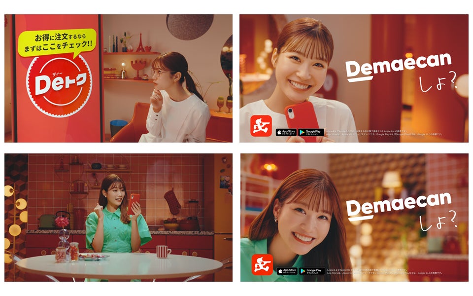 『出前館』テレビCM、"めるる"こと生見愛瑠さんが出演する「Demaecanしよ?」シリーズは、2021年12月に「ファーストフード」篇、「カフェ・ドリンク」篇の放映を開始、2022年2月には「韓国料理」篇、「サラダ」篇、「スイーツ」篇の放映を開始し、今回で第3弾となります。シリーズ最新作となる第3弾では、「Deトク」篇、「ピザ半額祭」篇の展開となり、それぞれのパターンで最後に「Demaecanしよ?」という問いかけで思わず頼みたくなるようなCMの構成となっています。「Deトク」篇は、『出前館』でお得に注文できるお店を特集している「Deトク」の紹介をしており、今日のお得なお店を天の声につられるように『出前館』で探す“めるる”の可愛らしい仕草や、お得だらけな店舗にワクワクする表情も見どころです。また、「ピザ半額祭」篇は、『出前館』ではおなじみのキャンペーンの紹介となっており、“めるる”の「半額!これも半額!半額…!」という声でお得に楽しめることを伝えています。