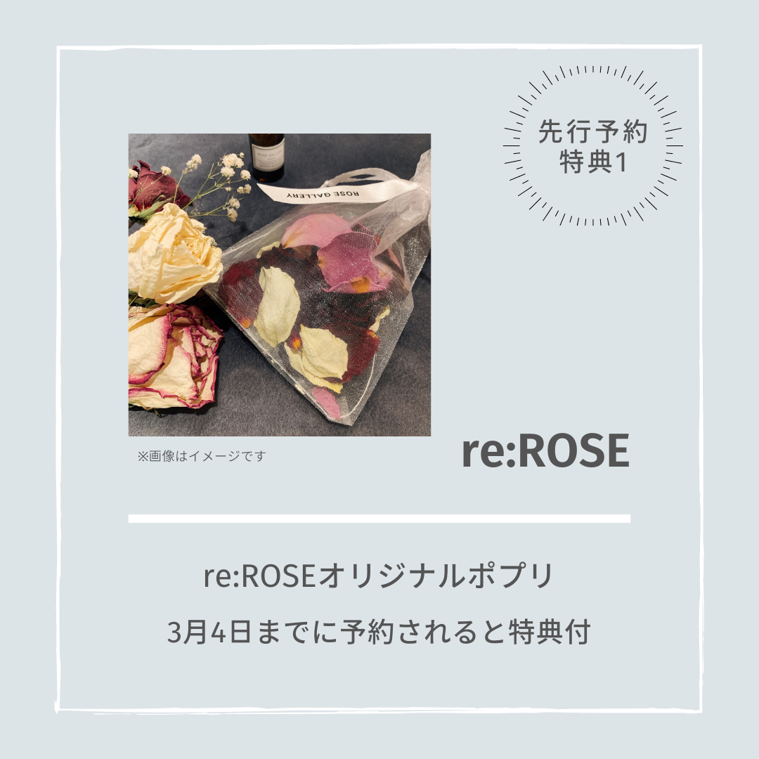 2022年2月18日~3月4日のおいて予約いただいたお客さまには、「re:ROSEオリジナルポプリ」と「メレンゲ菓子を1個」プレゼントいたします。