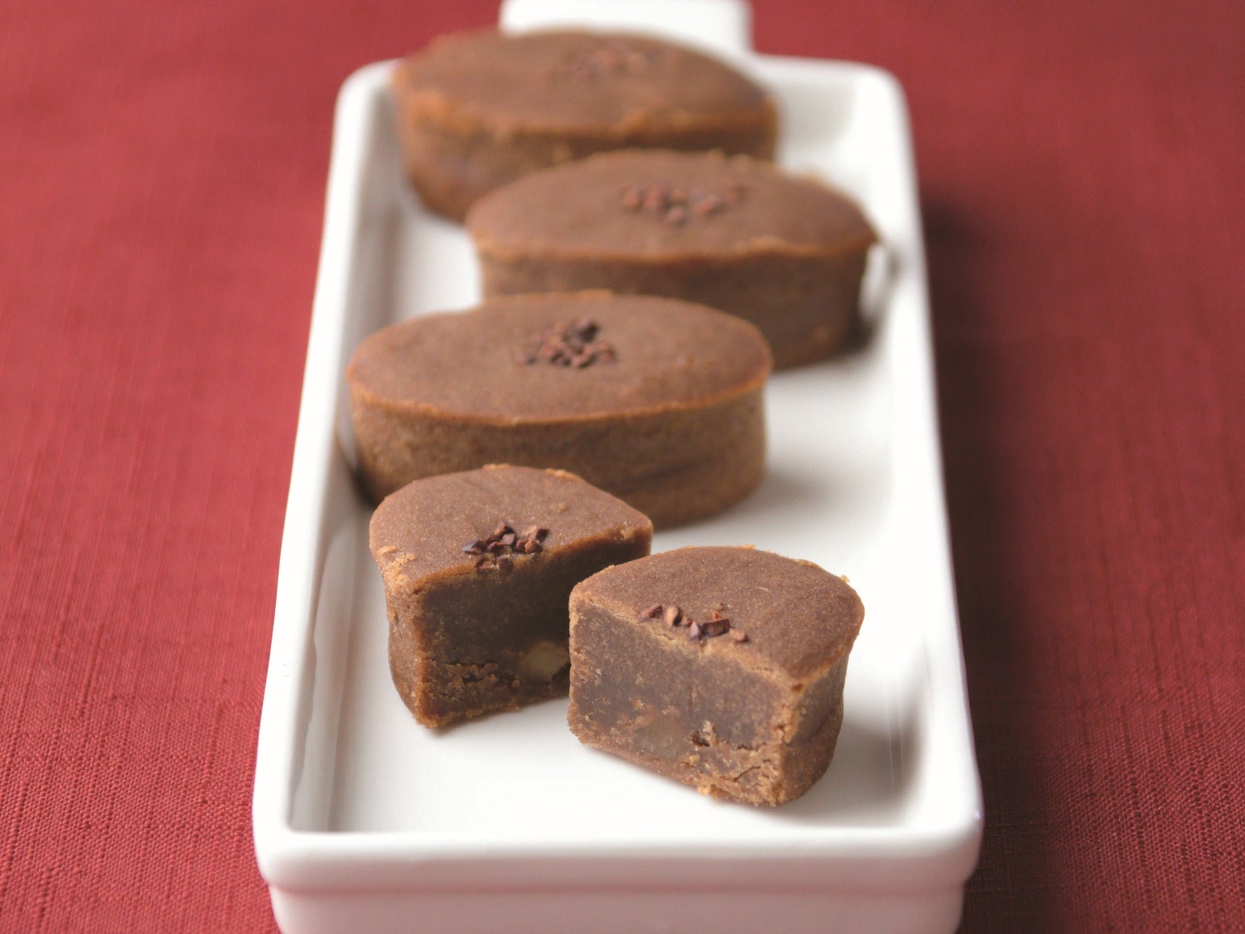 濃厚なチョコレート餡に餅粉、卵黄、バターを配合し、しっとりと焼き上げました。口に入れた瞬間ほろほろと崩れる、他にはない新食感の和スイーツです。