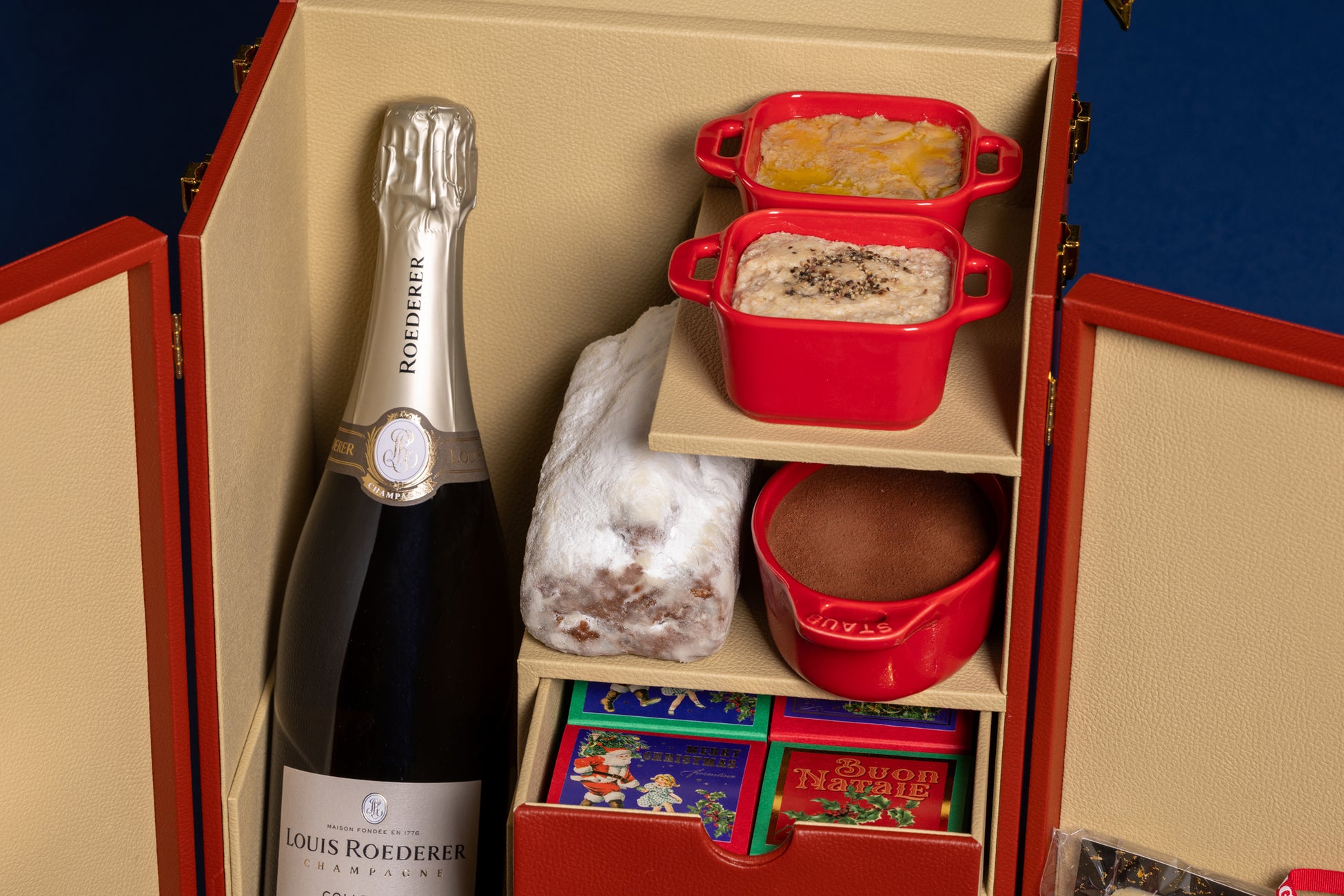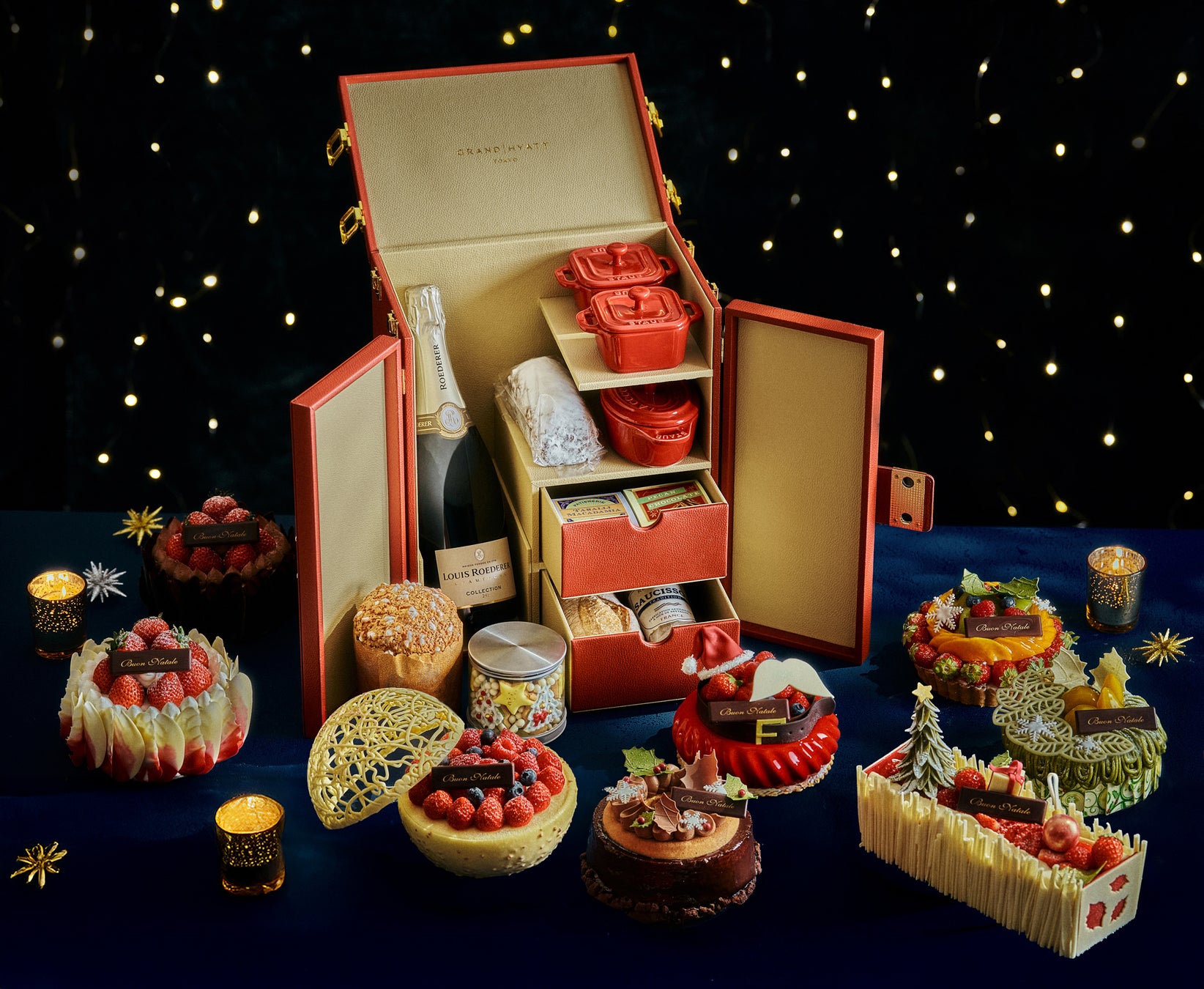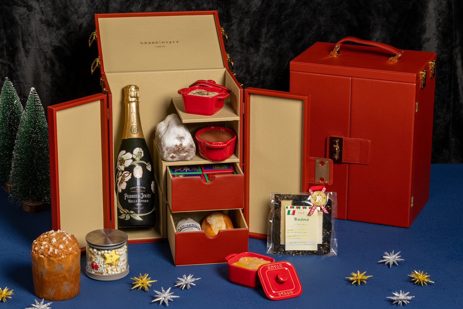 毎年ご好評をいただいているホリデーシーズン限定のギフトボックスに、今年はホテルロゴ入りのラグジュアリーなオリジナルボックス「プレミアム クリスマス ハンパー」が初登場いたします。6セット限定のこのボックスの中には、シャンパンボトルやチーズ、ヨーロッパ伝統のクリスマスブレッド「シュトーレン」と「パネトーネ」など、ホームパーティーにぴったりな15種類の自家製スイーツやセイボリーを詰め合わせます。引き出しを開くと、フランスパンやサラミ、クリスマスモチーフのデザインを施した華やかな小箱入りのクッキー、チョコレートが登場。アドベントカレンダーのようなわくわく感も味わっていただけるボックスになるよう細部にまでこだわりました。さらに、フレンチのシェフによる自家製のフォアグラのテリーヌとポーク リエット、シナモンやカルダモンなどのスパイスを加えた香り豊かなティラミスは、フランス製鋳物ホーロー鍋ブランド「STAUB」のミニココットにお入れし、テーブルをより一層華やかに彩ります。シャンパンは、ロシア皇帝アレクサンドル2世の味覚を満たすために生まれた至高のプレステージシャンパーニュ「ルイ・ロデレール クリスタル」をはじめ、美しいアネモネのボトルに包まれた洗練された味わいが魅力の「ペリエ ジュエ ベル エポック」、成熟感と芳醇な果実味を備えた「ルイ・ロデレール コレクション 245」の3種類の中からお好みのものをお選びいただけます。