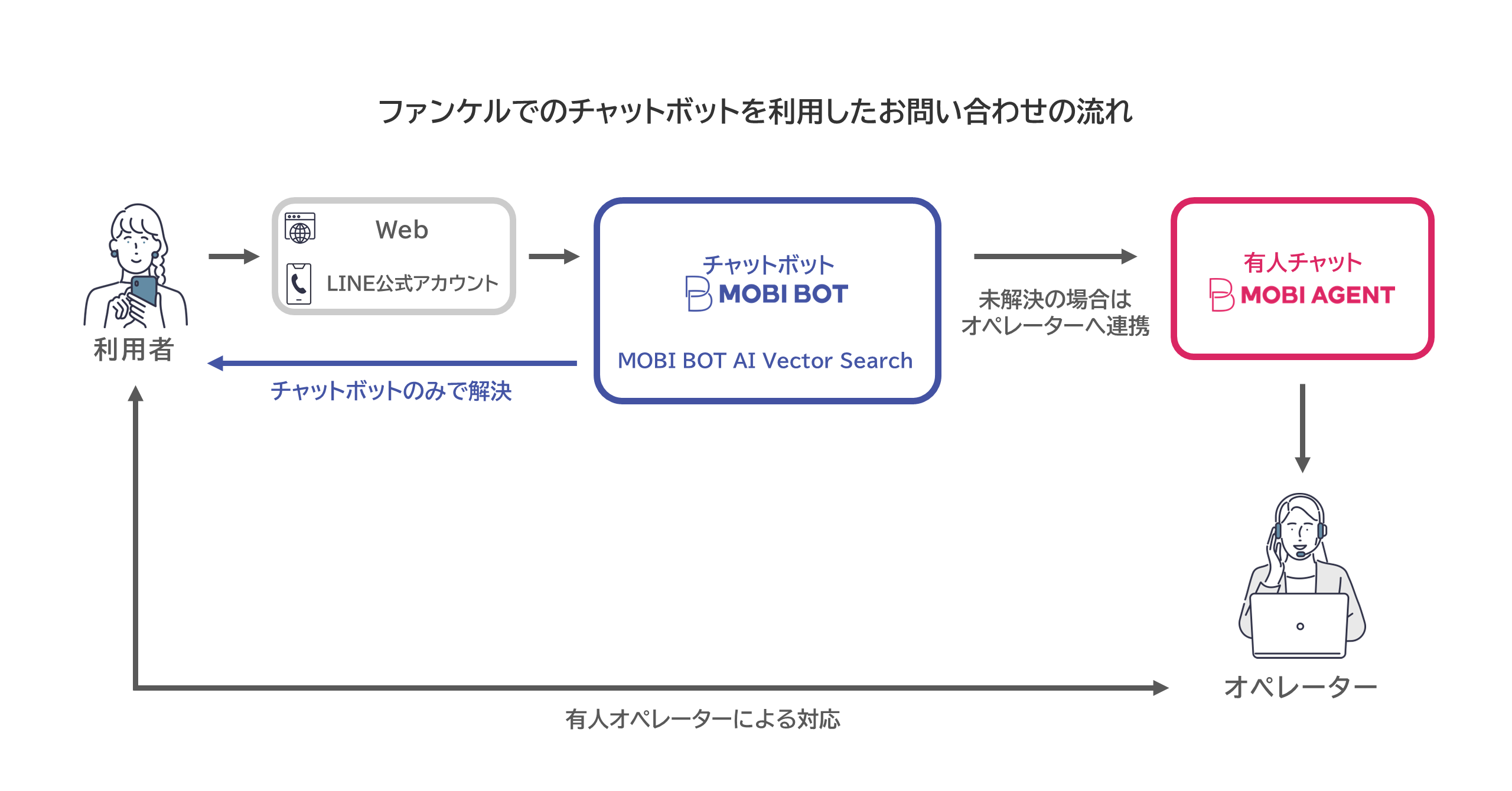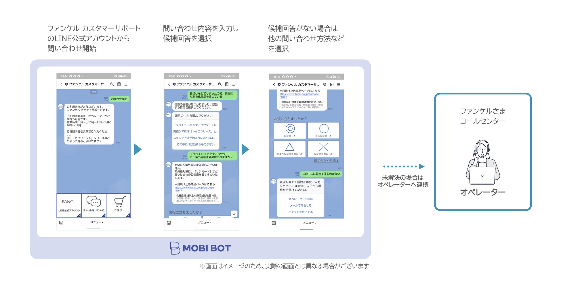モビルスが提供するベクトル検索型チャットボット「MOBI BOT AI Vector Search」の導入により、ファンケルの「ファンケルオンライン」FAQサイトのチャットサポートとLINE公式アカウント「ファンケル カスタマーサポート」に、利用者がFAQサイト上のチャットボットに質問を入力すると、求めている情報を正確かつスムーズに検索できる問い合わせチャットサービスが構築されました。