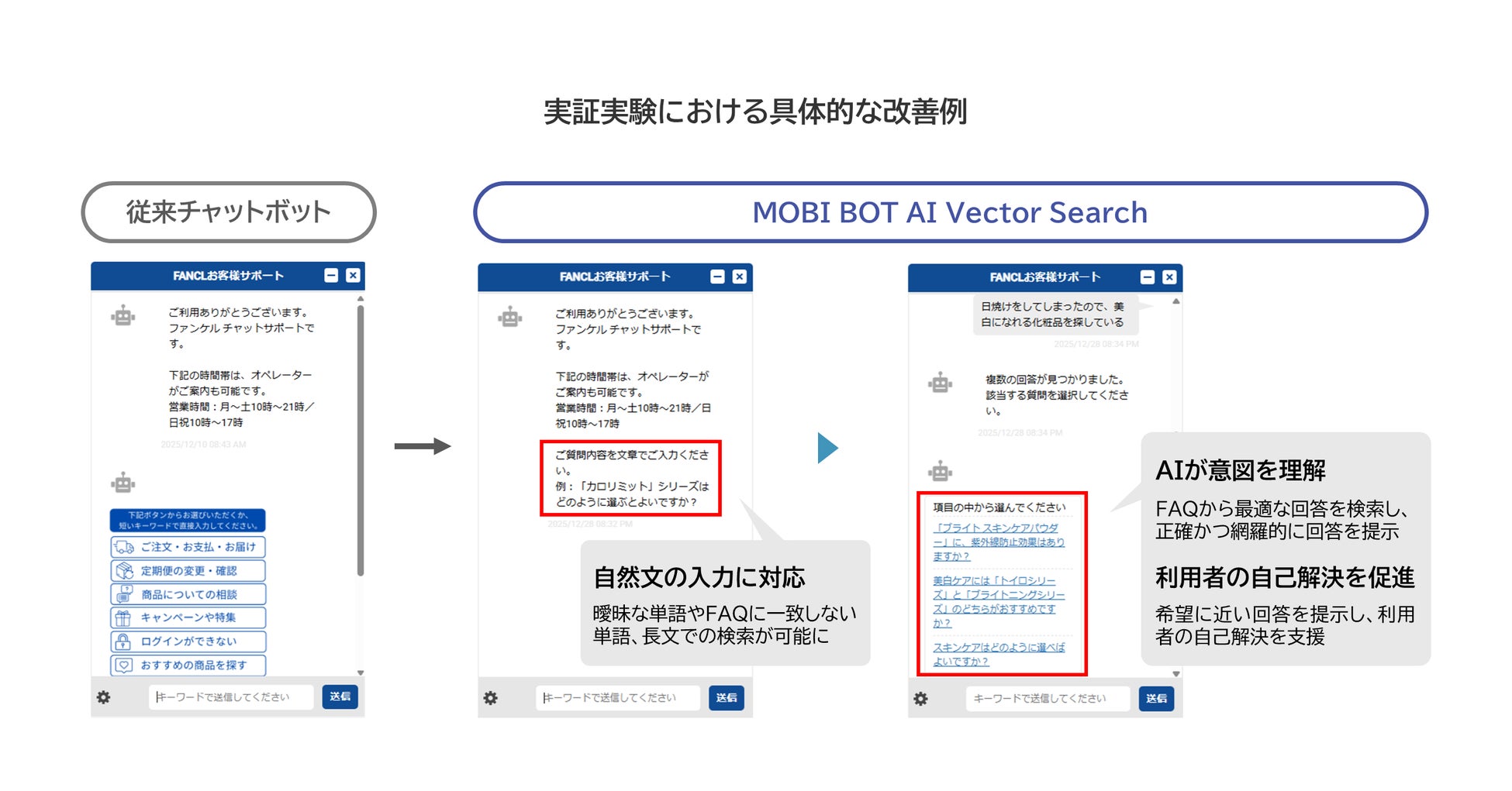 モビルスのAIを活用したベクトル検索型チャットボット「MOBI BOT AI Vector Search」がファンケルで導入 実証実験では従来のチャットボットに比べ、問い合わせ完了数が約2割向上
