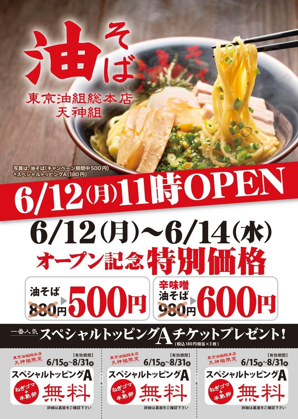 【福岡県 初出店!】油そば専門店『 東京油組総本店 天神組 』6月12日(月)オープン!