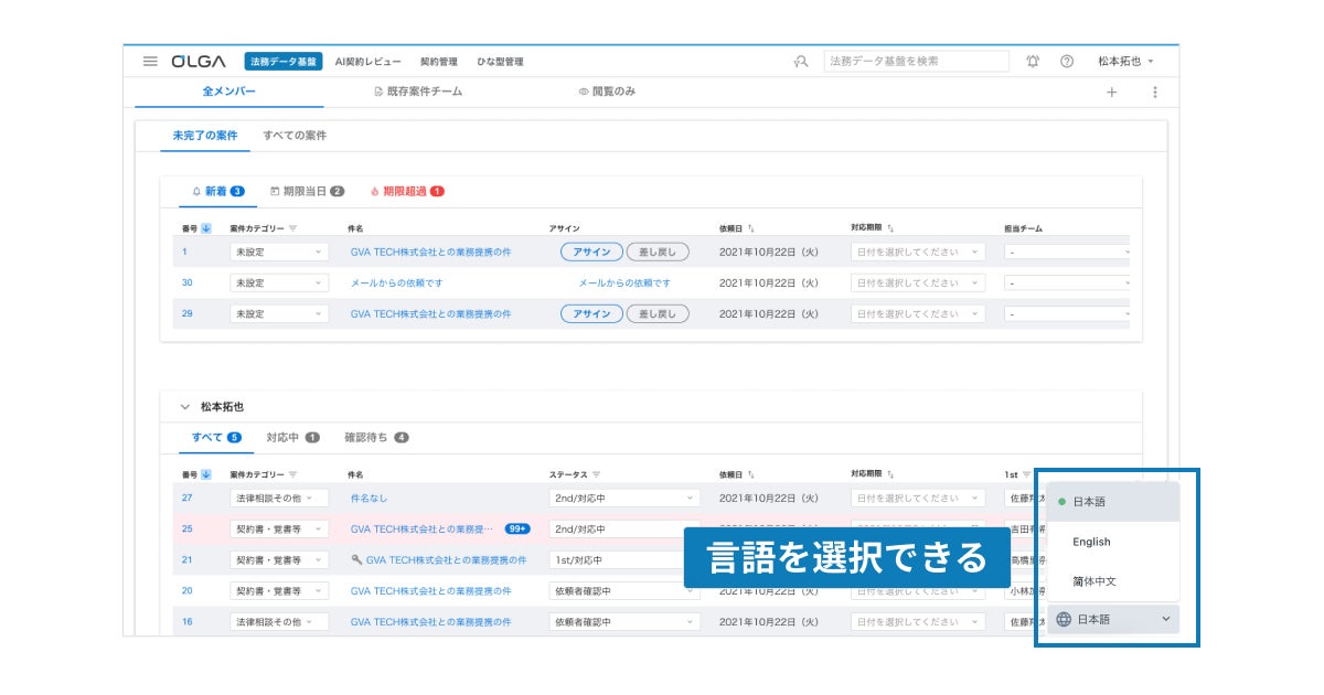 案件ボード・案件詳細: 法務担当者は、国内外から集まる全ての案件を、使い慣れた言語で一覧・確認できます。日本語を母国語としないメンバーでもスムーズに「OLGA」をご利用いただけます。