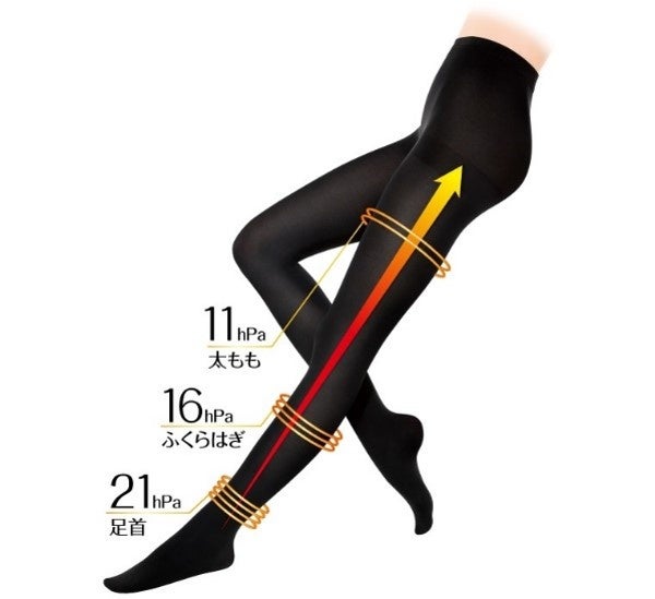 足首から上へいくほど圧力が低くなる設計(足首21hPa、ふくらはぎ16hPa、太もも11hPa)で 脚を軽やかにスッキリと美しく整える。