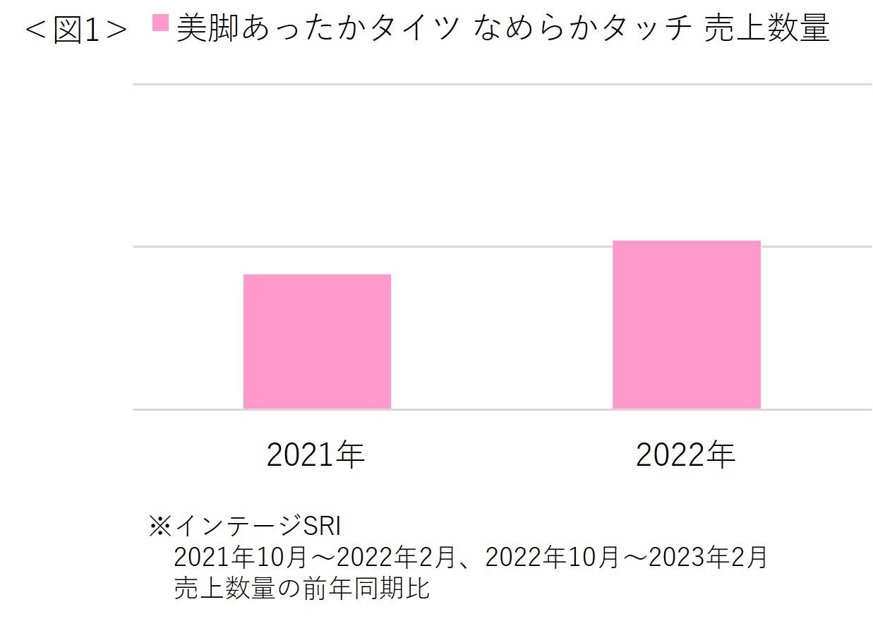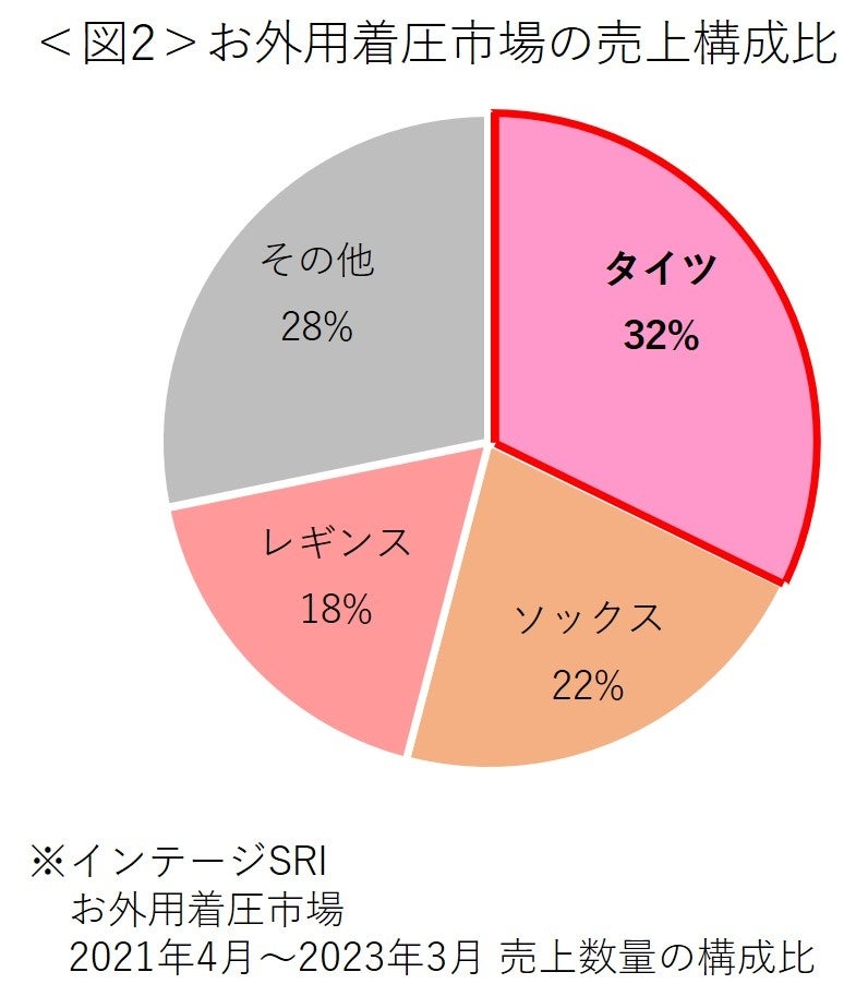 2022年秋に発売された「美脚あったかタイツ なめらかタッチ」は、前年比125%と売上が拡大しました<図1>。 また、お外用着圧市場では、タイツが外出時の冷え対策アイテムとしてシェアが最も大きく、32%を占めています <図2>。要因としては、毎年冬の防寒&美脚ケアアイテムとして、スリムウォークのタイツを継続購入いただけて いることに加え、外出制限が緩和されお出かけする機会が増えたことから、売上が拡大したと考えられます。