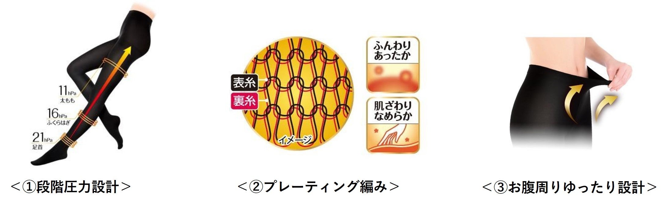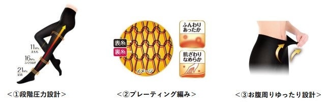 2022年発売時、お客様からは「あたたかさ」「なめらかさ」「程よい着圧」について好評をいただきました。 なめらかな肌ざわりではきやすく、あたたかい設計で冷えから脚を守ります。さらにお腹まわりはやさしいフィッ ト感で、1日中快適に引き締め、美脚ケアをしていただけます。